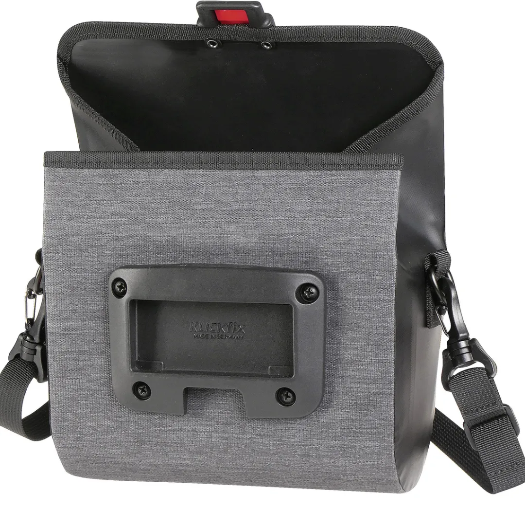 Simply click the bag into your handlebar mount using the KLICKfix adapter plate on the back. You can remove the shoulder strap with carabiners and stow it inside the bag so it doesn’t get in the when cycling. This bike handbag is as mobile as you are!