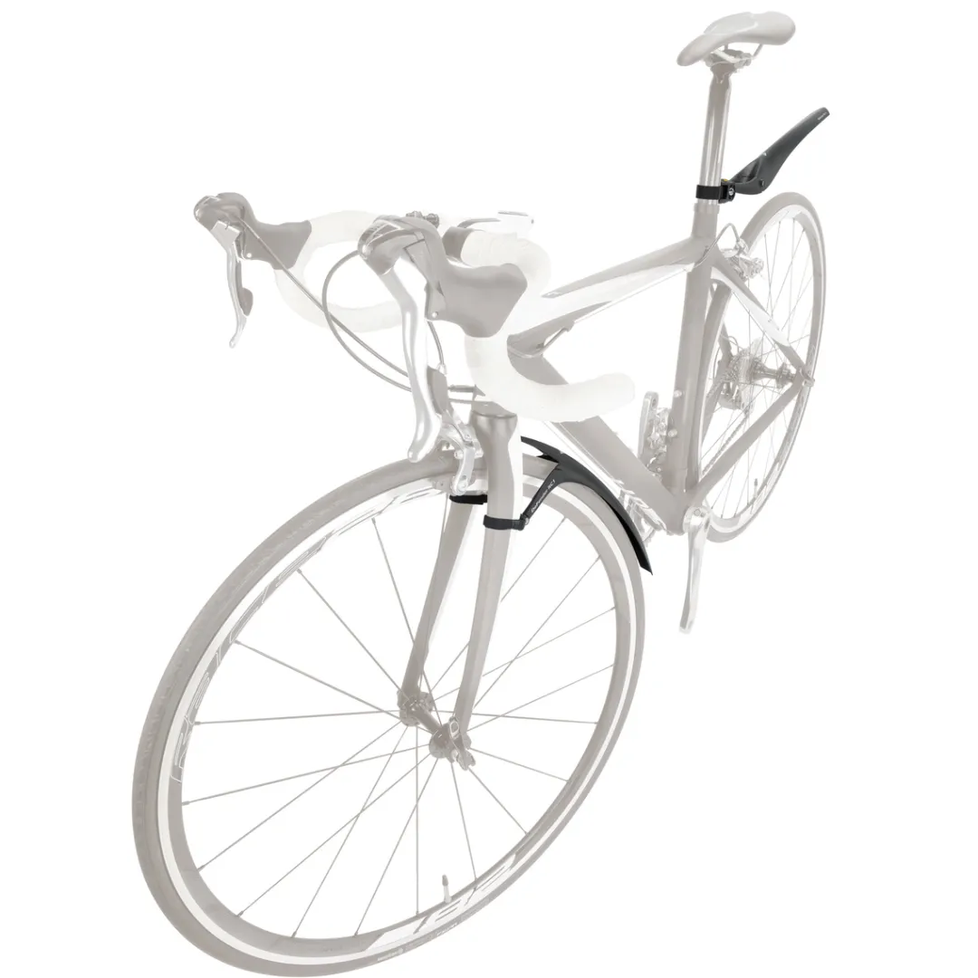 Super slim mudguard set for road bikes. Clip and two straps for easy attachment to the fork; velcro straps for attaching the rear mudguard to the top and seat tube; angle-adjustable.