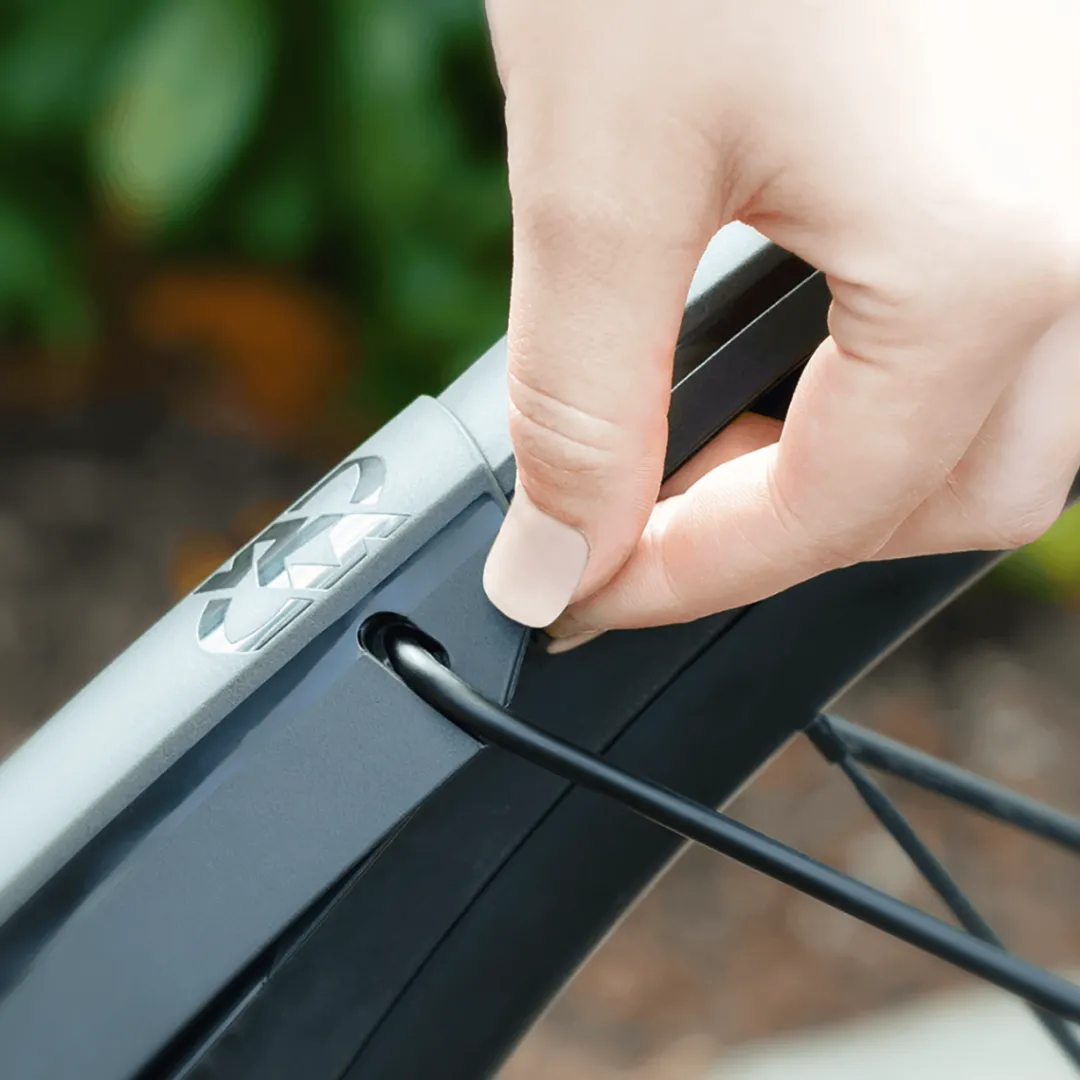 Depending on weather conditions, the mudguard extension can be quickly clipped on to extends the mudguard by generous 17 centimetres. The larger gap between mudguard and tyre at the bottom also keeps off splashes of mud even more effectively.