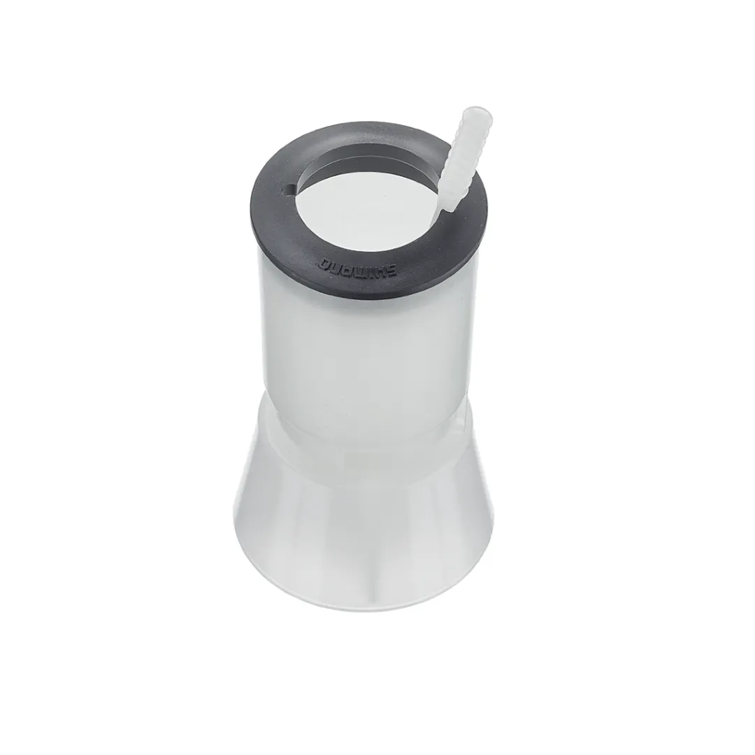 Practical oil funnel by SHIMANO for BL brake levers with M5 thread. When filling and bleeding SHIMANO MTB/hybrid disc brake systems, the screw-on attachment serves as a filling and expansion reservoir for the filled mineral oil. The oil stopper can be hooked into the funnel ring when open and plugs the fill opening with its seal after use to ensure for clean working. After use, the funnel can be placed on the base to prevent it from tipping over.