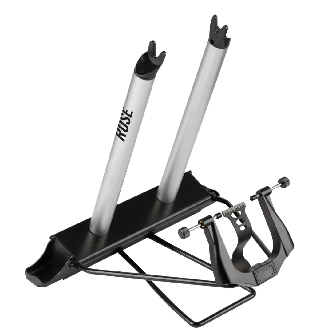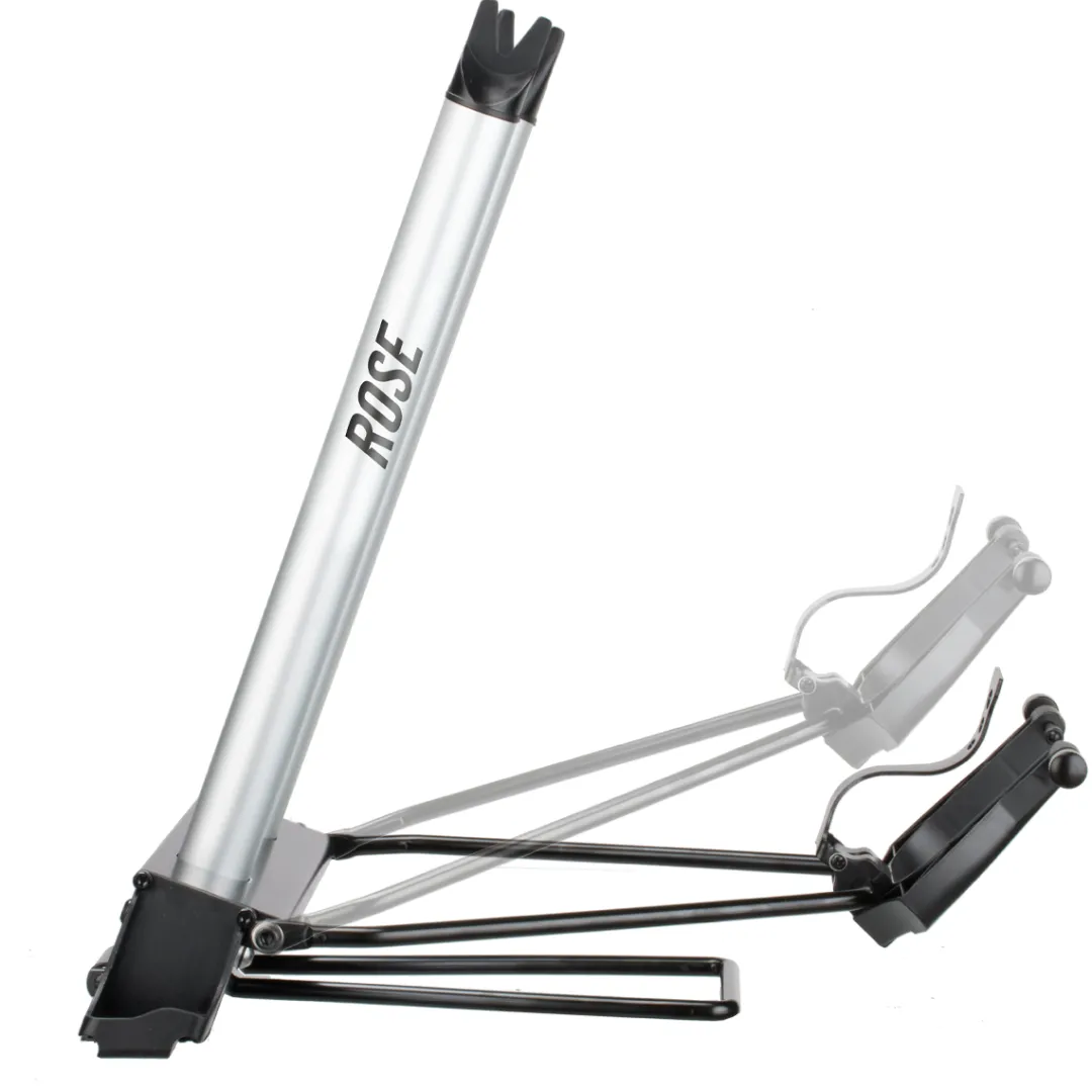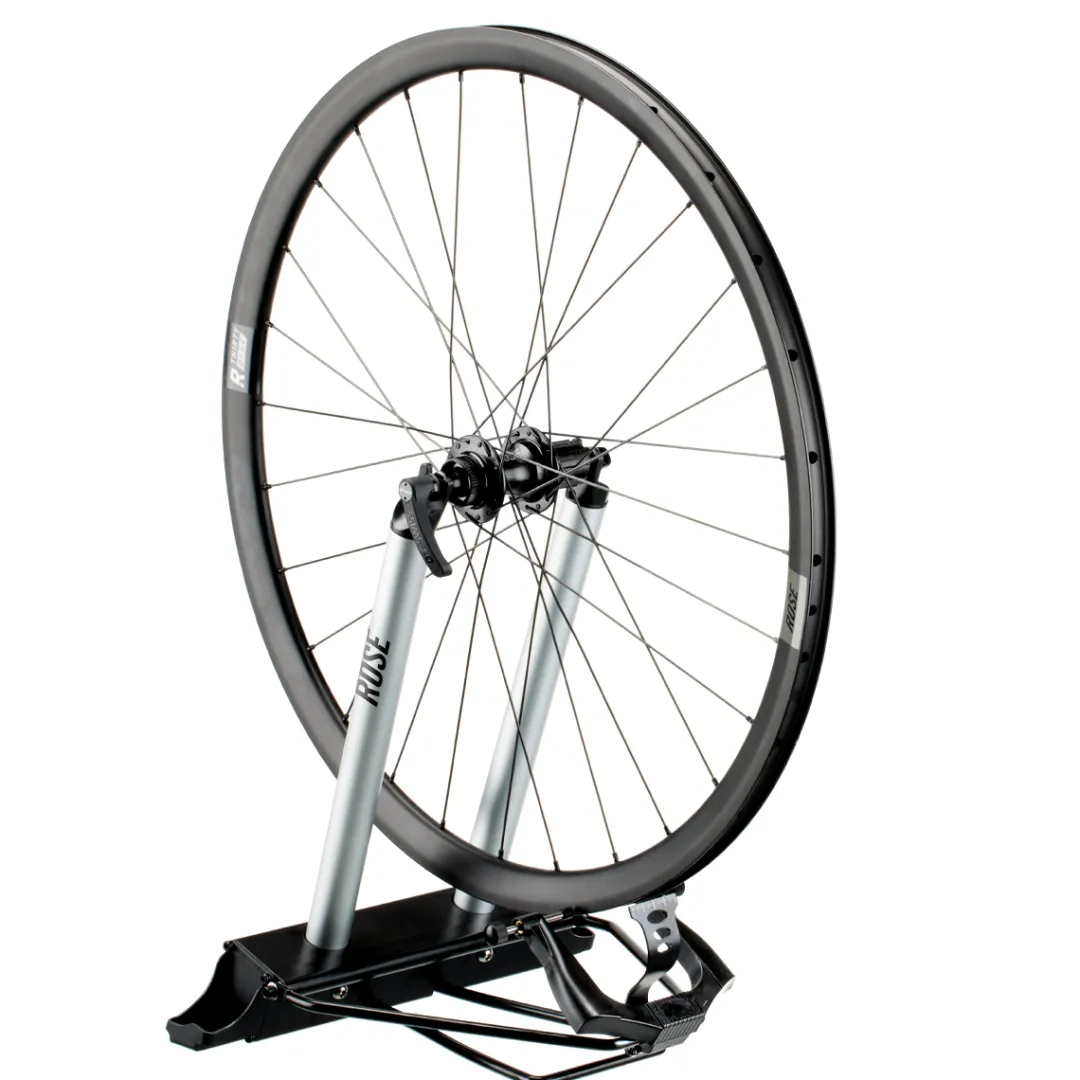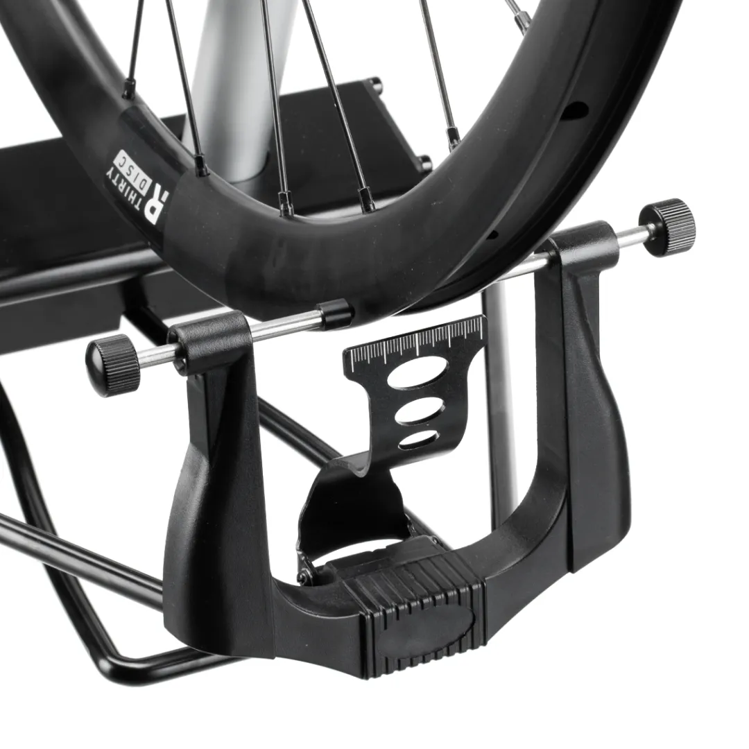 High-end centering device for daily workshop use or occasional use at home. Its large ground contact area gives the 2-Zent.A: a secure hold on workbenches, tables or out and about in the boot of the car. Its torsional rigidity achieves a maximum level of accuracy and continuously variable quick adjustment makes adjustment to any hub width possible without any difficulty. The ROSE ”2-Zent.A:” is precise and easy to operate. Radial and lateral run-out can be centered at the same time. The variable folding mechanism makes it small and easy to transport.