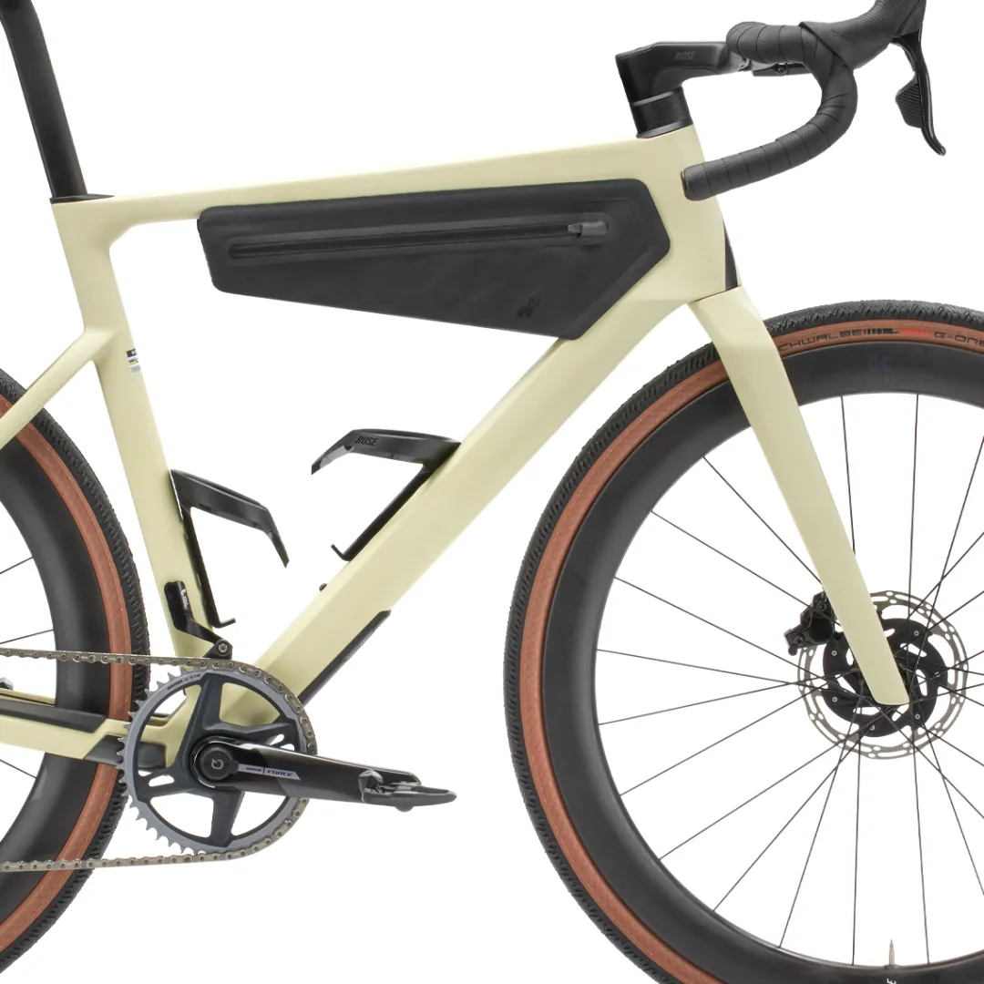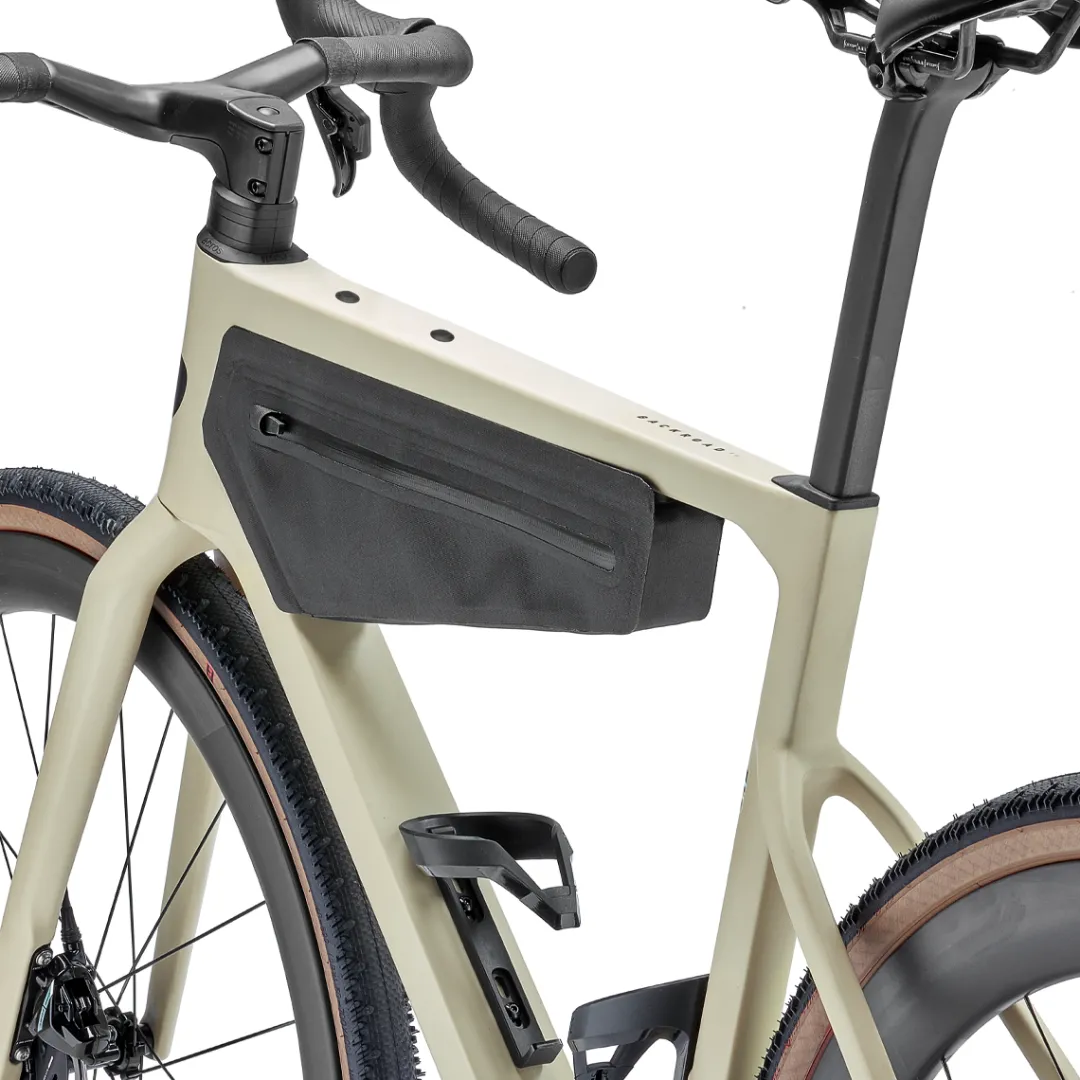 With its spacious main compartment, the frame bag offers enough space for snacks, a rain jacket, a spare inner tube – or whatever you need on a fast training lap or in the middle of nowhere in the gravel desert. Another flat side pocket also offers quick access to your smartphone, gels or cash. So far, so practical.