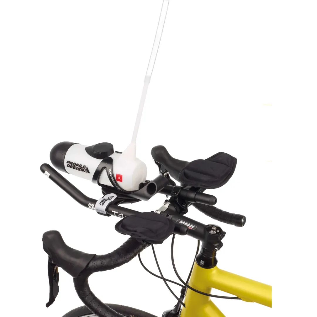 The Profile Aero HC hydration system provides a flow of liquid without you having to reach down to the bottom tube, saving you crucial seconds. The bottle can be filled or cleaned by turning the cap, while a second opening allows it to be filled while in a horizontal position. The width can be adjusted via recessed wedges, so that it can be used by as many riders as possible. The length of the screwed on bottle cage can be adjusted. A removable tachometer mount is positioned behind the bottle (width: 30 mm, Ø 26 mm).