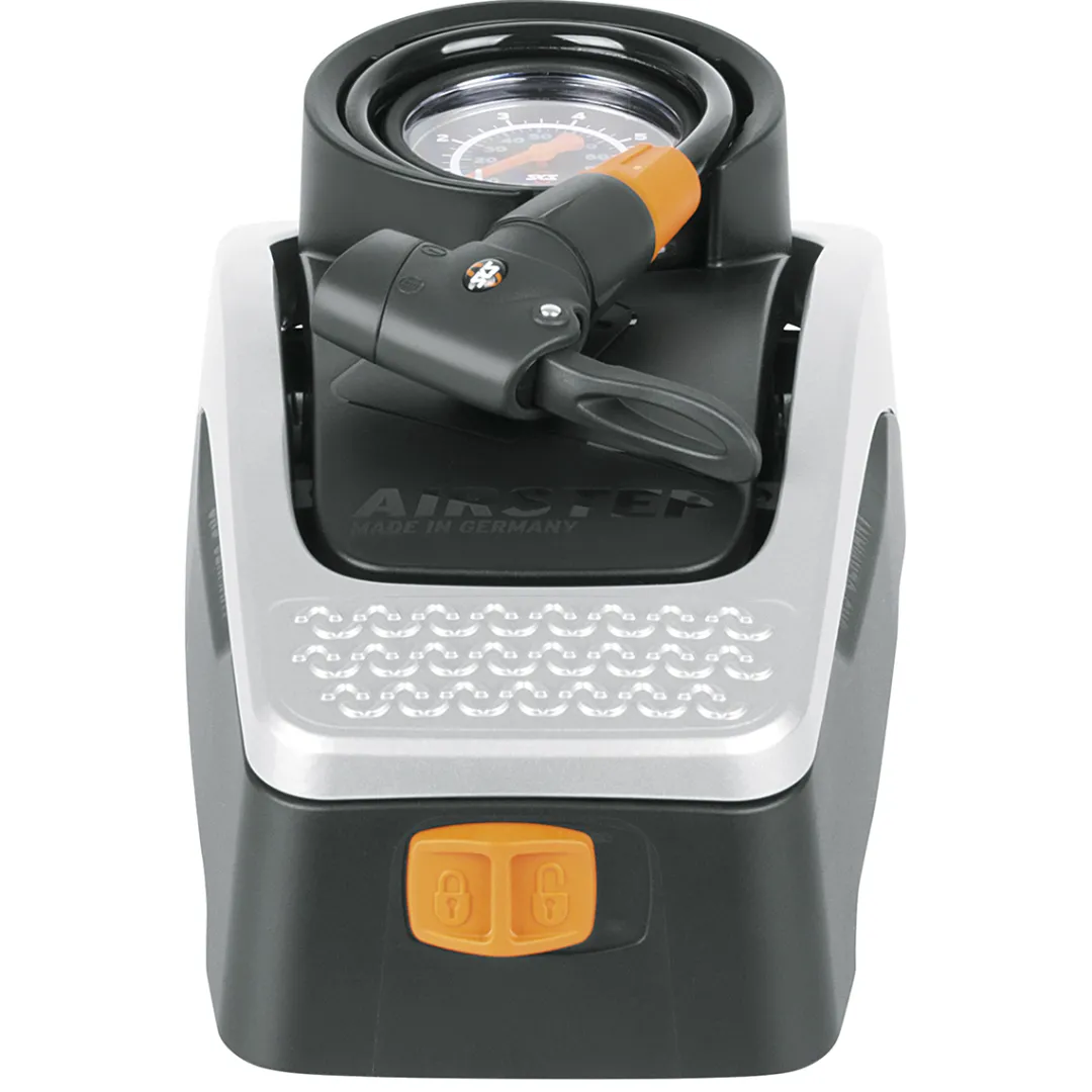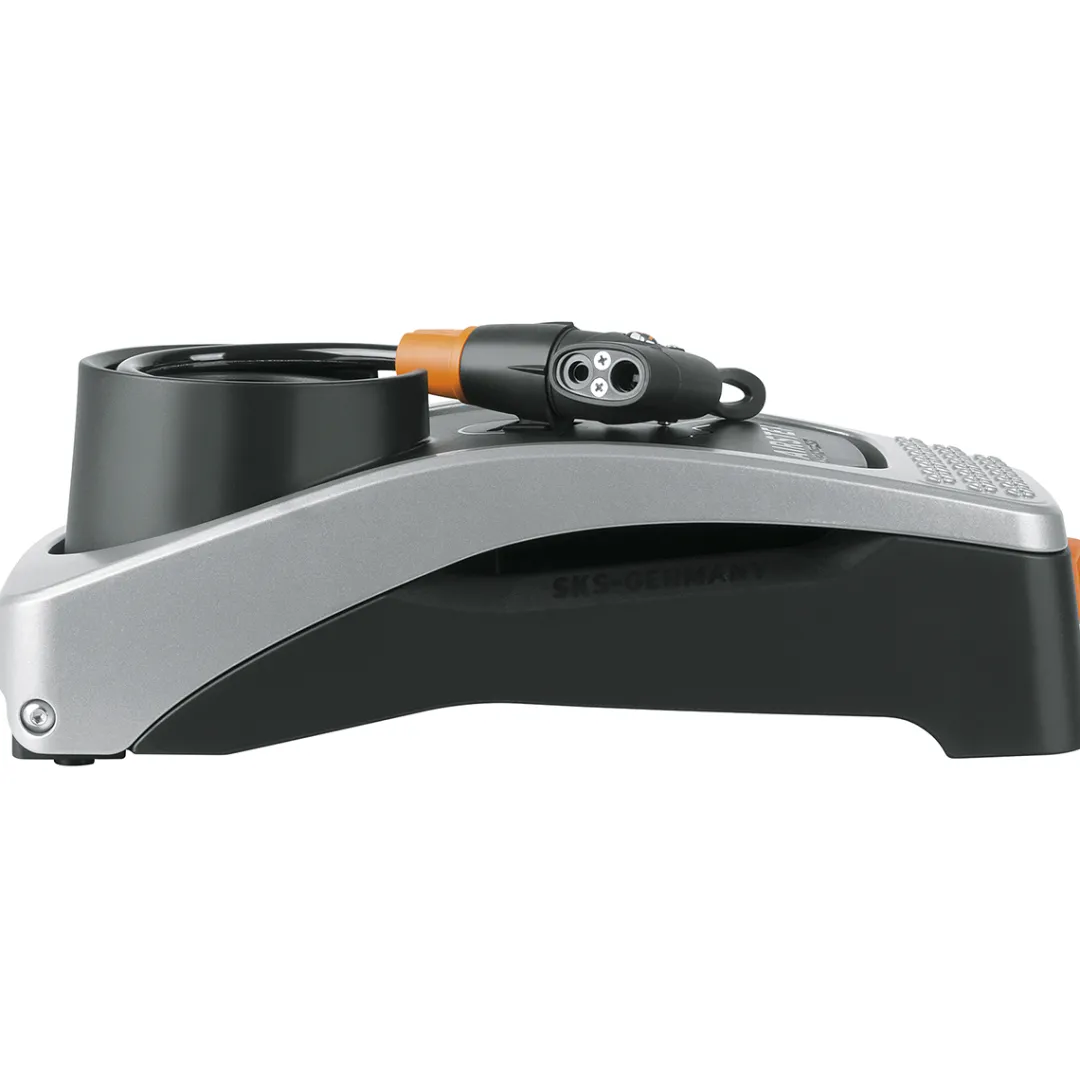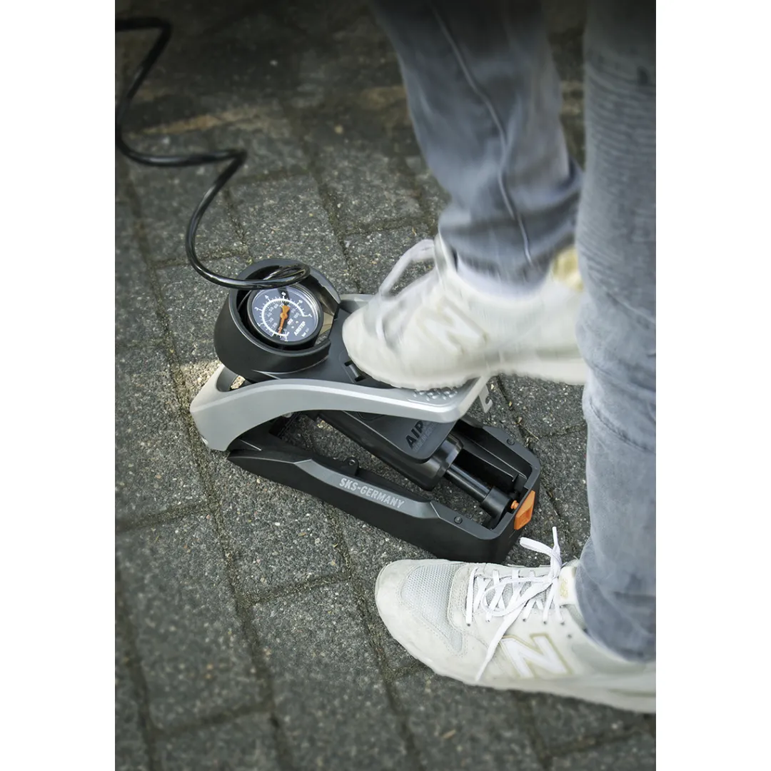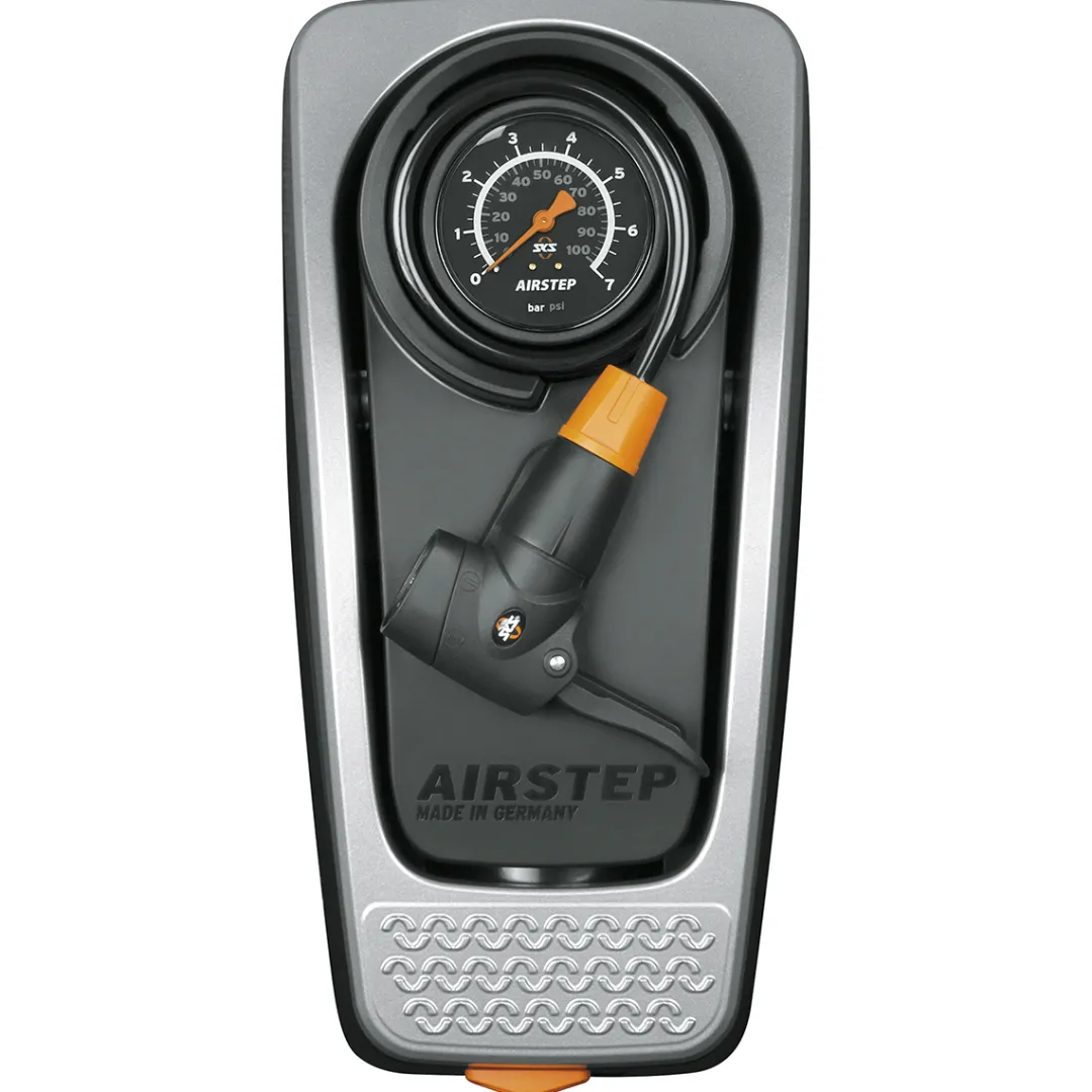 The Airstep foot pump by SKS helps you inflate your bike tyre step by step. The compact, foot-operated bike pump can be used in an upright and back-friendly position. The large pressure gauge on top is still easy to read. The steel pressure barrel delivers a power of up to 7 bars, which makes it perfectly suitable to inflate tyres of touring, cross or fitness bikes as well as large-volume MTB tyres up to 29”. Thanks to a MultiValve pump head, the pump is compatible with all valve types (Dunlop, Presta, Schrader). When not in use, you can store the 1.5 m long spiral hose inside the integrated compartment and fold down and lock the foot pedal. The pump’s compact size and wall bracket are a perfect space-saving solution.
