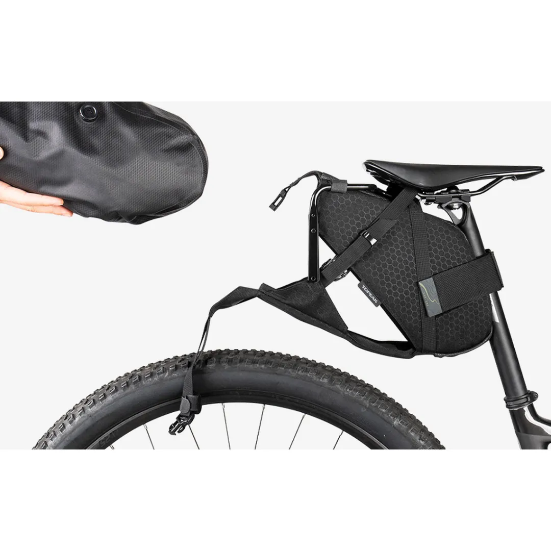 The BackLoader X saddle bag by Topeak ensures plenty of space on your bikepacking adventures and dry things.