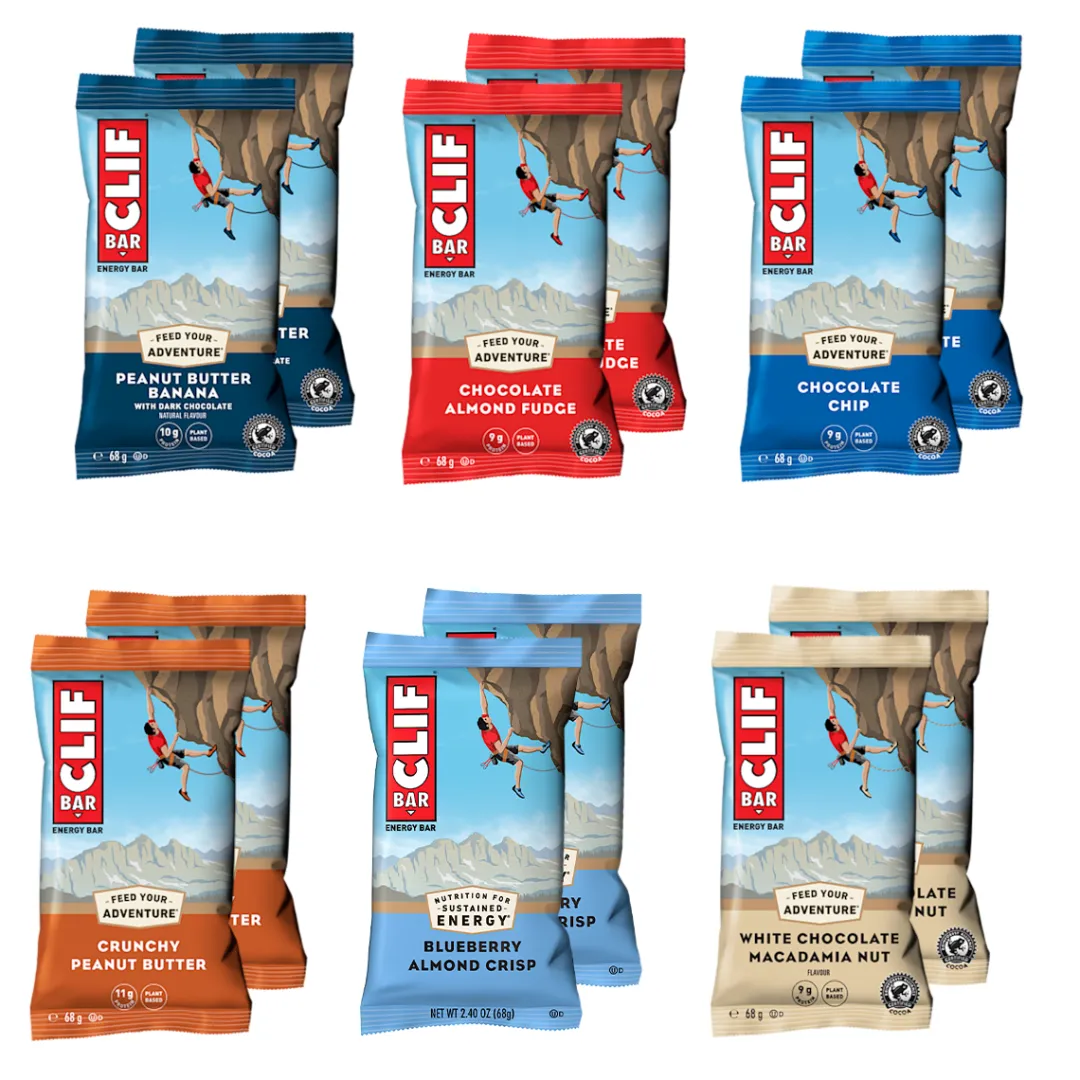 Enjoy a variety of Clif Bar flavours in this mixed set of 6 different bars! The oat-based carbohydrate bar is recommended for sports activities, outdoor adventures or as a small snack between meals. With the Clif Bar you benefit from a special mix of carbohydrates, fibre and protein. The bar is made without trans fatty acids, preservatives and corn syrup (replaced with rice syrup). The pleasant consistency makes it easy to eat even when you’re under stress. It can be eaten before, during or after exercise.