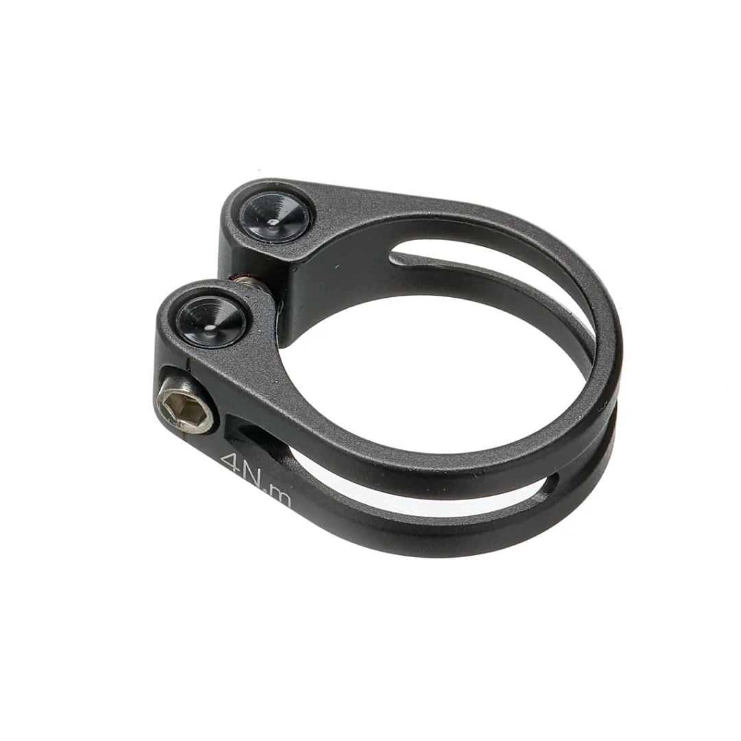 CNC-milled aluminium clamp with a special clamping mechanism. The hex bolt is not screwed into a fixed thread, but into a movable threaded piece. This prevents tension in the area of the seat post clamp.
