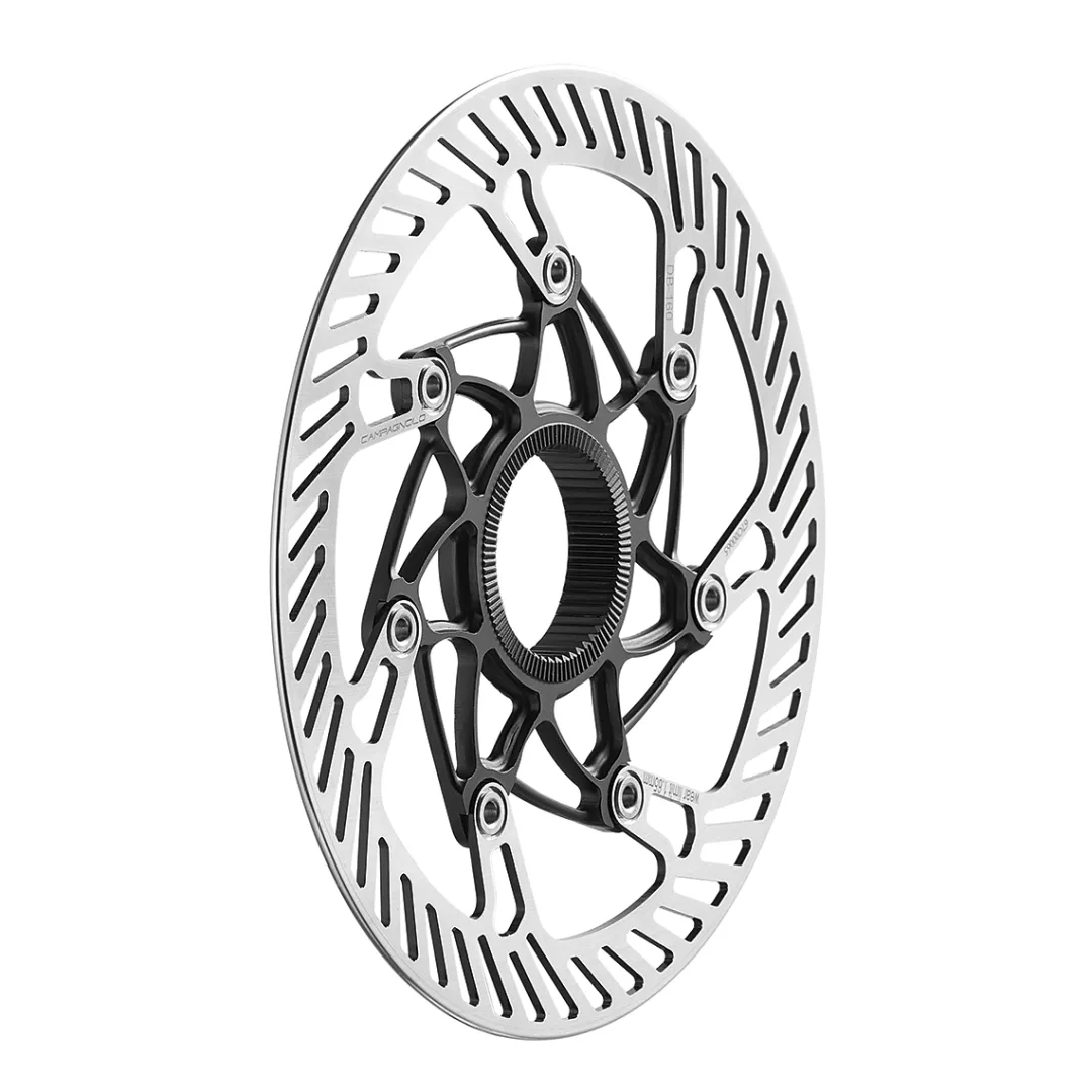 As part of the introduction of the revolutionary Super Record 12s™ and Record 12s™ 12-speed shifting groupsets, Campagnolo’s engineers have boosted the performance of their brake rotors. Thanks to even lower tolerances at the joints between steel disc and aluminium spider, the heat resistance and braking power under critical conditions could be further improved. The rounded profile of the Campagnolo AFS/CenterLock C3 brake rotors allows for easy wheel installation and meets UCI regulations on disc brakes.