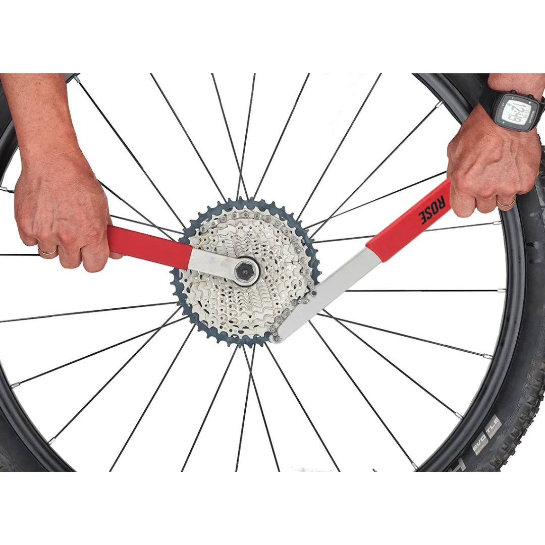 ROSE’s chain whip is the tried and tested tool for comfortable handling and reliable hold when removing all 7- to 11-speed cassettes. You can replace or dismantle your cassette quickly with the solid chain whip. Thanks to its anti-slip handle and safe power transfer of the long chain, the sprocket remover promises easy handling, especially when dealing with seized bolts.