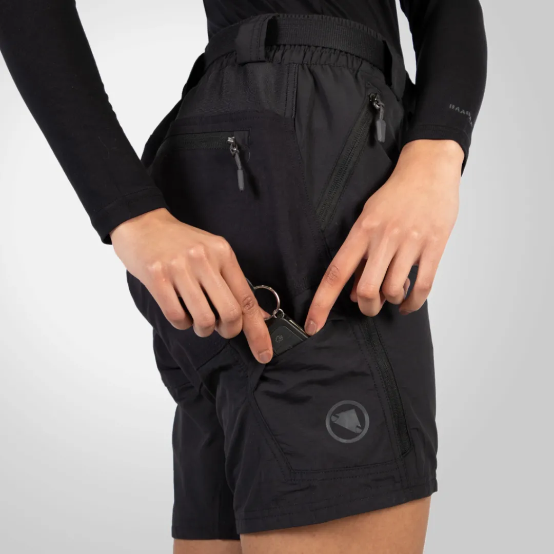 With the WOMEN HUMMVEE SHORTS WITH LINER SHORTS by Scottish bike clothing specialist ENDURA, you are always ready for the trail, because the iconic women’s MTB shorts have always stood for their cleverly thought-out functionality and were developed in collaboration with renowned Enduro riders. Ample storage space and removable ENDURA CLICKFAST inner pants with an integrated 200 seat pad turn this pair of women’s shorts into a versatile companion. Thanks to their robust material, the MTB shorts will easily keep up with your every move, and their water-repellent PFC-free finish provides extra weather protection.