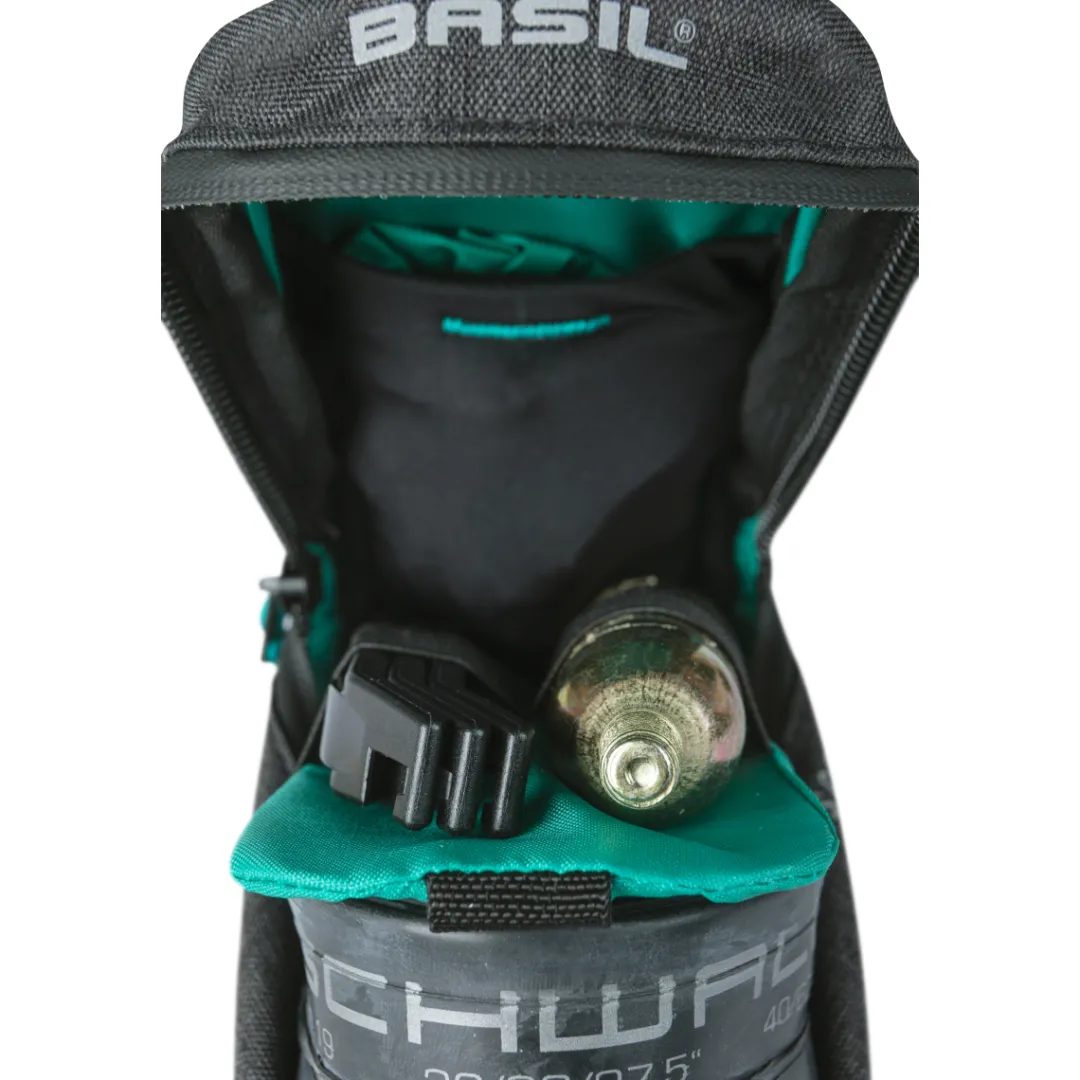 With the Discovery 365D saddle bag M by BASIL, you’ll always have all essentials at hand. The bike bag allows you to stow away a spare tube, tools, energy bars and other stuff and keep them safe, neatly arranged and well protected from the elements. The coloured lining makes it easy to find individual items and a divider with rubber loops helps keep things organised. For tours in persistent rain, there’s a weather protection cover included which is stowed away in an inner compartment.