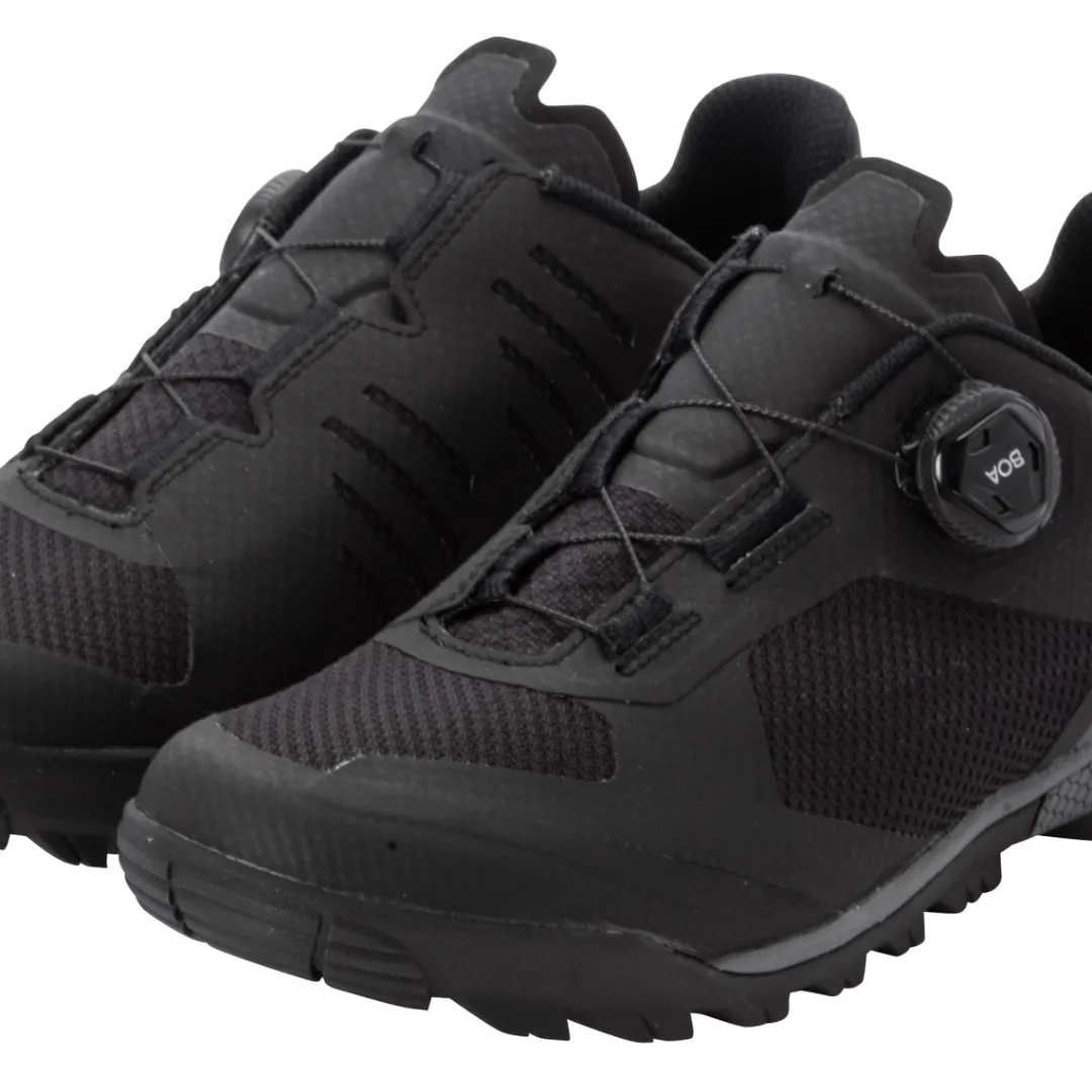 The dynamic tread pattern provides a larger contact area and good abrasion resistance. The bolt-on cover of the cleat system allows you to either ride with or without cleats. A nylon reinforcement ensures best power transfer to the pedal. The sole is convex for easy walking. Besides, it offers high shock absorption on midfoot and instep.