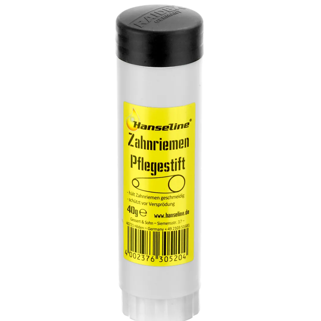Small stick – great care effect. The Hanseline drive belt care stick protects drive belts from premature ageing and ensures their elasticity. At the same time, preserving the surface of the drive belt prevents it from sticking or freezing. The special paraffin-based care stick protects against the loss of plasticisers thanks to its direct application and is therefore ideal for post-treatment after cleaning the drive belt to remove dust or moisture.