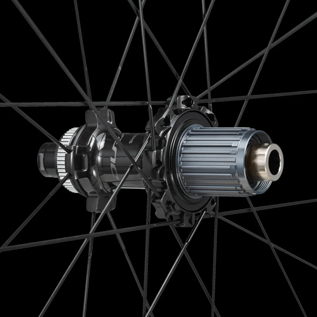SHIMANO decided to fit the wheel with a 12-speed specific freehub. In addition, the Direct Engagement freehub system scores with up to 30% more stiffness and yet less weight compared to a standard SHIMANO pawl hub system.