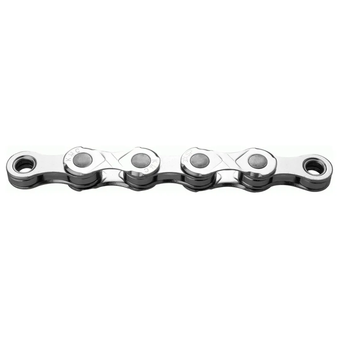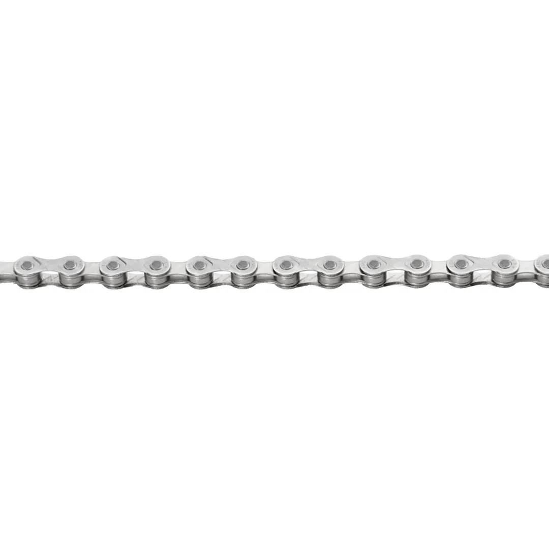 Modern, powerful mid-drive bikes need stronger, e-bike specific chains. The KMC e10 chain for 10-speed derailleur systems on electric-assist bike drivetrains stands out for excellent wear resistance and strength. Reinforced riveted joints, hardened steel alloys and a corrosion-resistant nickel coating promise extremely high durability. Minimized tolerances not only promise increased torsional stability, but also improve the penetration of chain lubricants while keeping away abrasive dirt particles. Thanks to the X-Bridge chain design and chamfered plates, you’ll benefit from first-class running and reliable shifting precision for excellent performance on city bikes, touring bikes and MTBs.