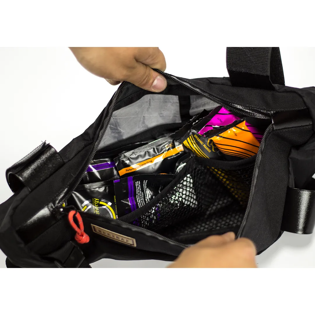 The FRAME BAG LARGE by Restrap offers plenty of bike packing storage for the frame triangle. Thanks to the zipper on both sides, this frame bag offers quick access to your stuff. Inside mesh pockets ensure optimised organisation.