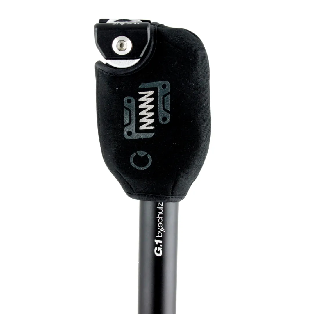 The Mudcover for the G.Series LT is a protective neoprene cover against moisture and dirt that perfectly fits the mechanical construction of the high-tech seat posts G1 and G2 in the long travel version (e.g. product code: 193924). Thus, the parallel linkage mechanism will still function properly – guaranteed. The protective cover also reliably prevents jammed fingers, e.g. when having a child seat mounted on the rack of your bike.