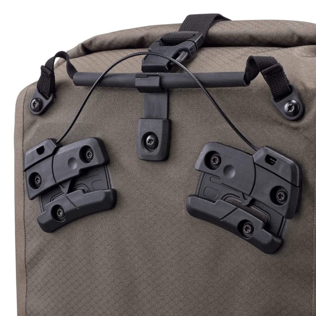 The QL3.1 mounting system allows for quick and easy attachment of the pannier. Simply position the bag on the lower mounting point, move it towards the rack, swivel it in from the left or right and securely attach it to both mounts on top. Removing the bag is just as quick and easy: Simply lift the bag by the handle and simultaneously swing it either to the left or to the right, done!