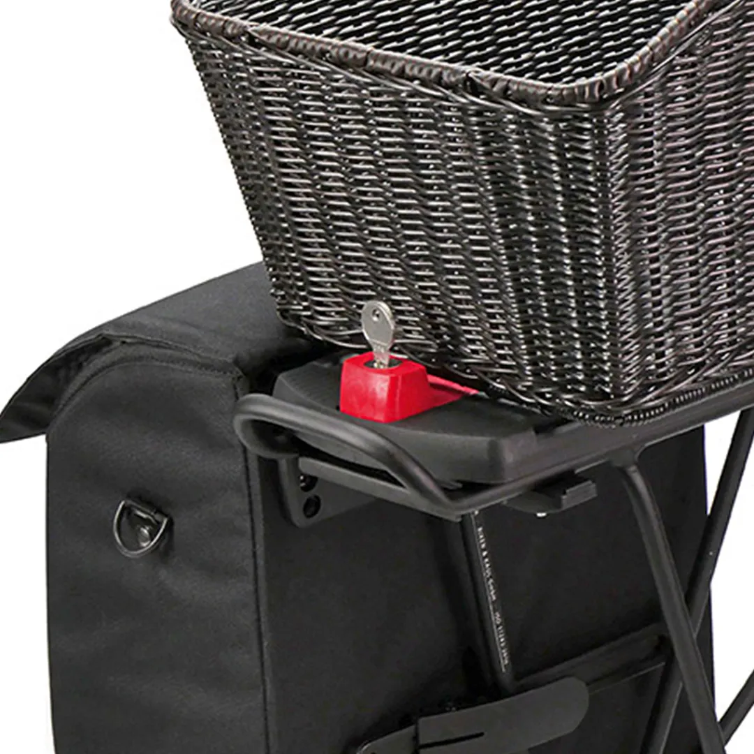 Ideal for combinations – the GTA System from KLICKfix is the ideal solution for cyclists that want to click side bags in with baskets, top cases, or boxes. The large plate creates an even platform. Baskets, boxes or topcases can be clicked into the middle with the GTA mounting set. Bags can be hung into the side slits with the GTA hook. All parts are locked together. The GTA adapter plate is screwed on with two stable brackets to the luggage rack (up to 14.5 cm wide).