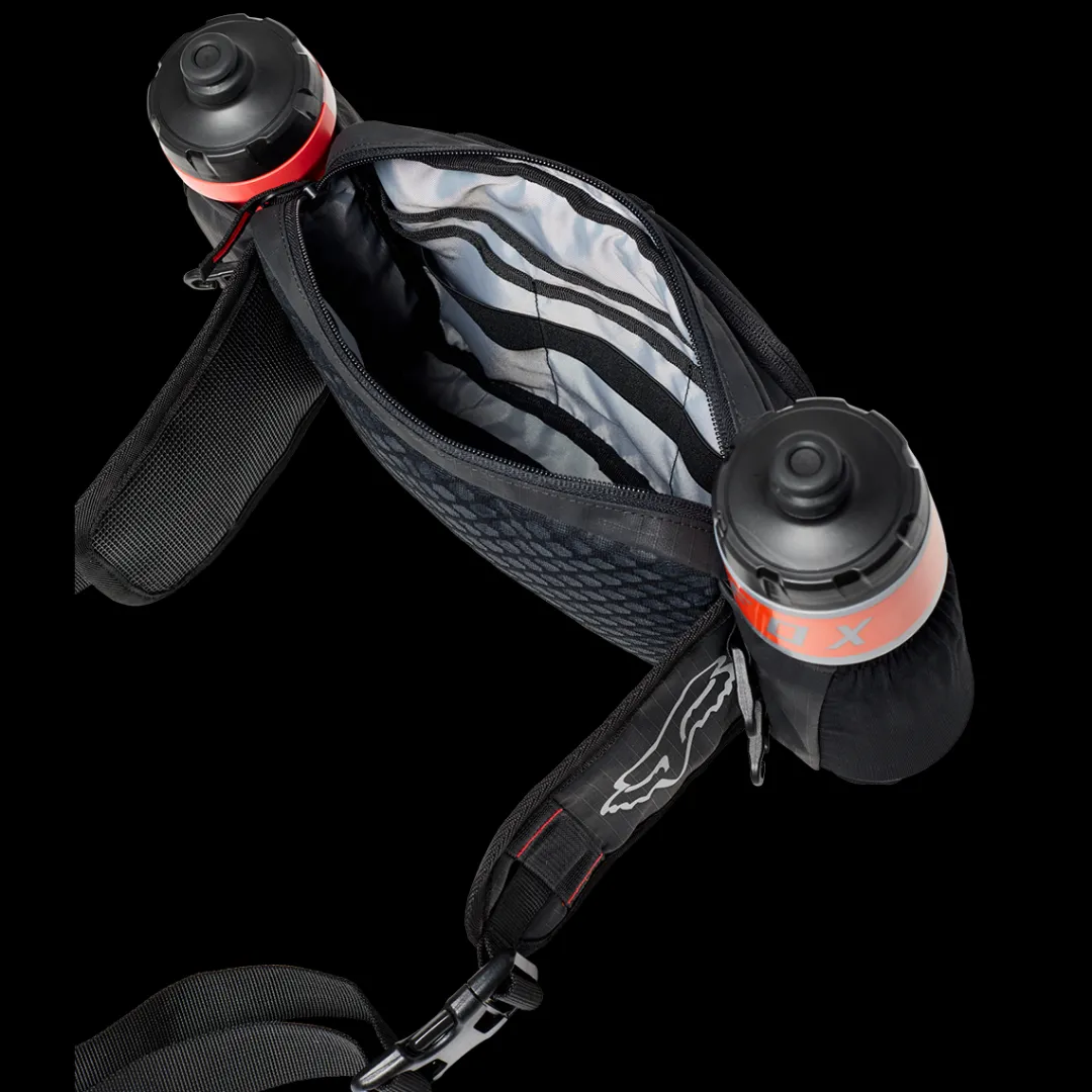 The HIP PACK by FOX is a minimalist hip bag that offers you enough storage space for your essentials with its 2 litres of volume. Your back remains free, the load is better distributed and you have absolute freedom of movement. Particularly practical are the two foldable bottle holders, which offer space for one drinking bottle each. When not in use, you can simply roll up the two compartments and secure them with hooks to save space.