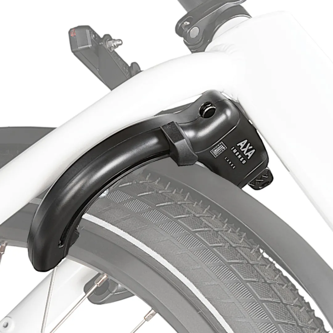 A frame lock like AXA’s Imenso Large is still a practical solution when it comes to quickly locking your bike. A rear wheel lock has proven its worth for short rides through the city, shopping tours or commutes to school and work. As the name suggests, the Imenso Large is also compatible with wide mudguards and high-volume tyres you can find on cargo and city bikes, MTBs or cruisers.