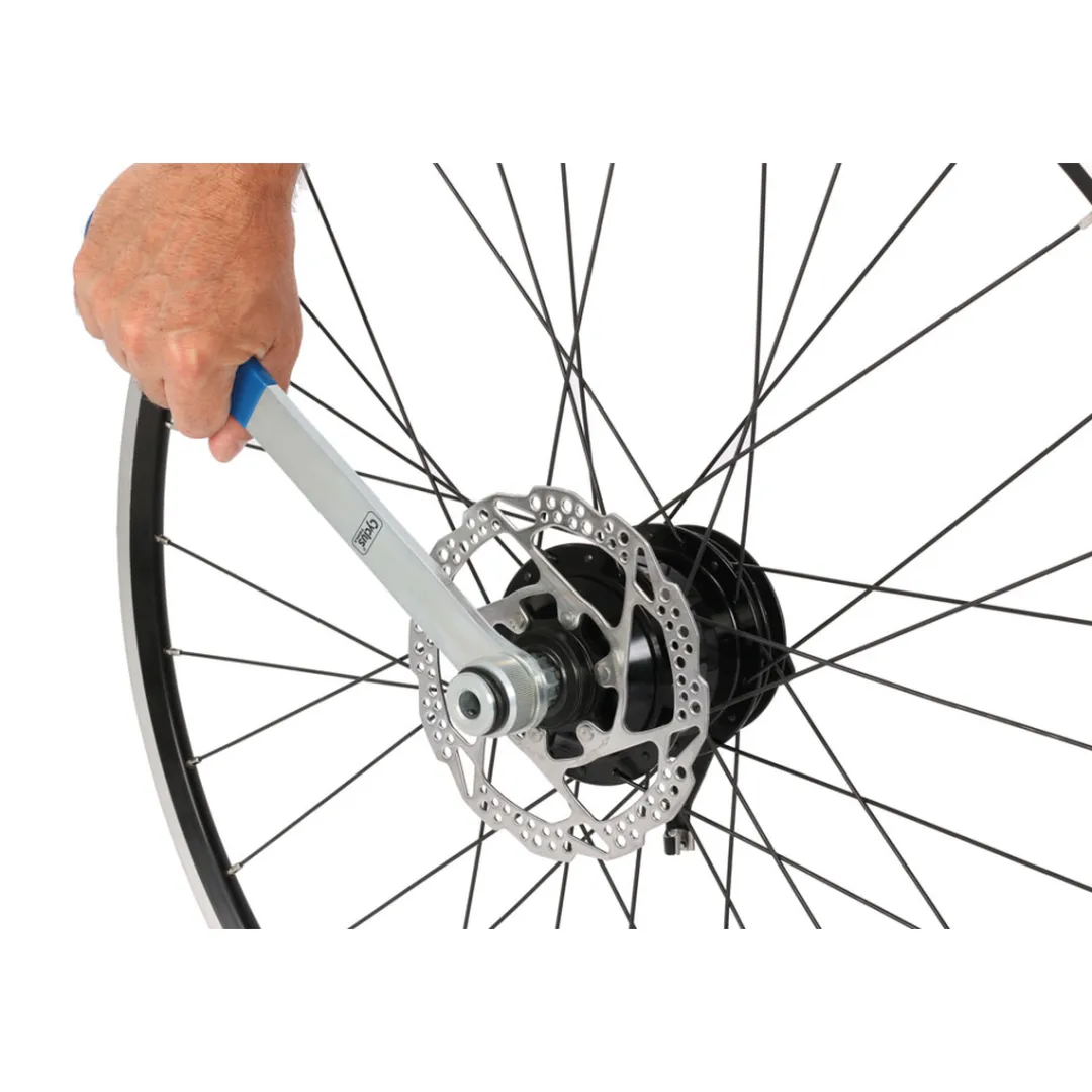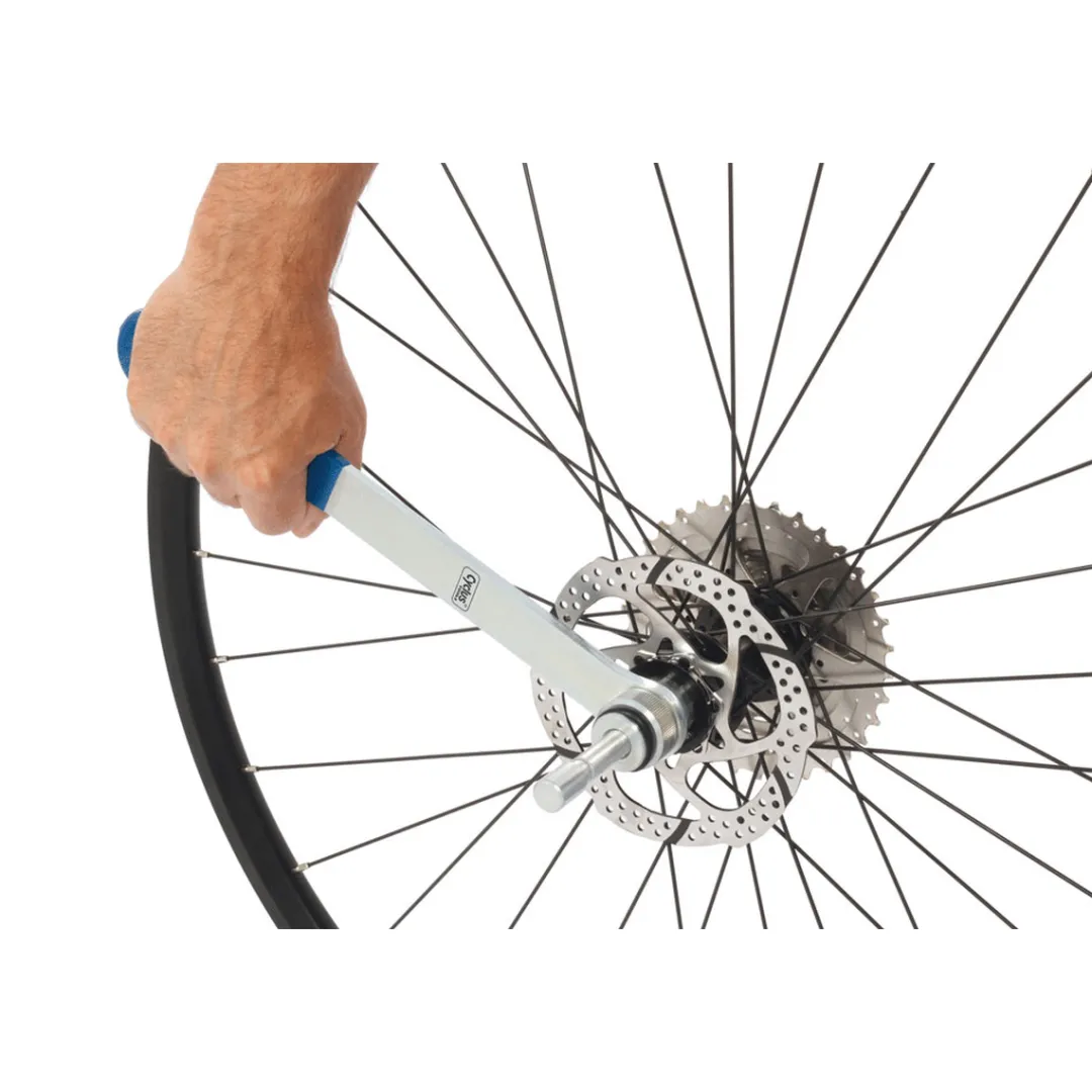 The tool comes with guides for thru axles, quick-release skewers and solid axles to ensure optimum force application and a secure hold of the pullers.