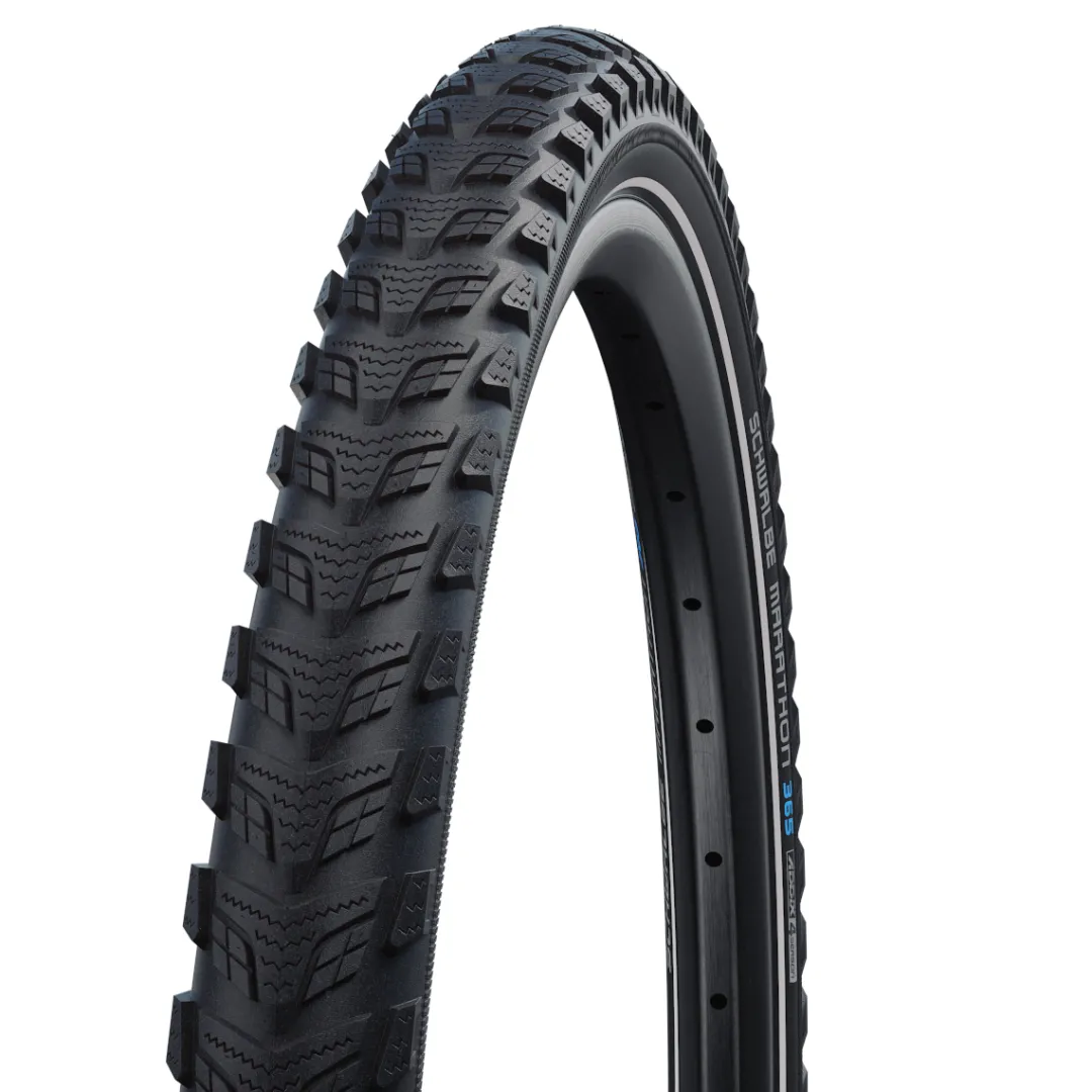 Whether in the cold, slush, rain or summer heat. The MARATHON 365 from Schwalbe is the all-season tyre for city traffic, touring and trekking. Also suitable for e-bikes (in Germany subject to registration) up to 50 km/h. With an optimised ADDIX 4 Season rubber compound and GreenGuard puncture protection insert, it is ideally equipped for all the extreme weather conditions that can occur while cycling year-round. The performance tyre also has the proven characteristics of the classic Marathon touring tyre GT 365.