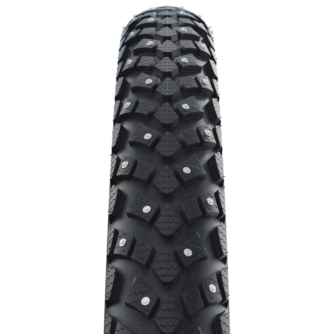 The Schwalbe MARATHON WINTER PLUS Spike tyre gives you full control on icy roads. Even cornering and heavy braking are easy to control. The spikes grip optimally at minimum pressure. The maximum pressure reduces running noise on the open road.