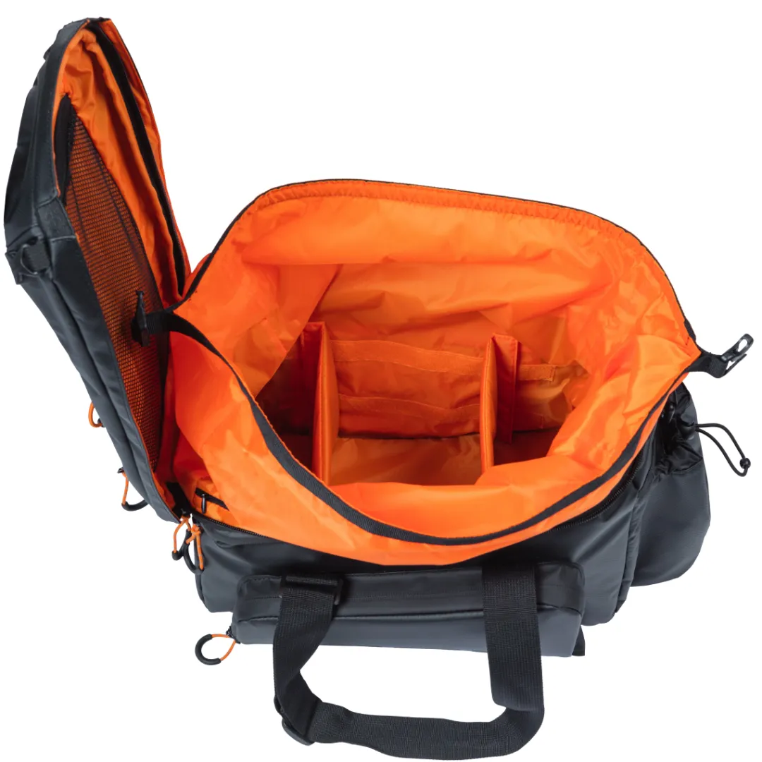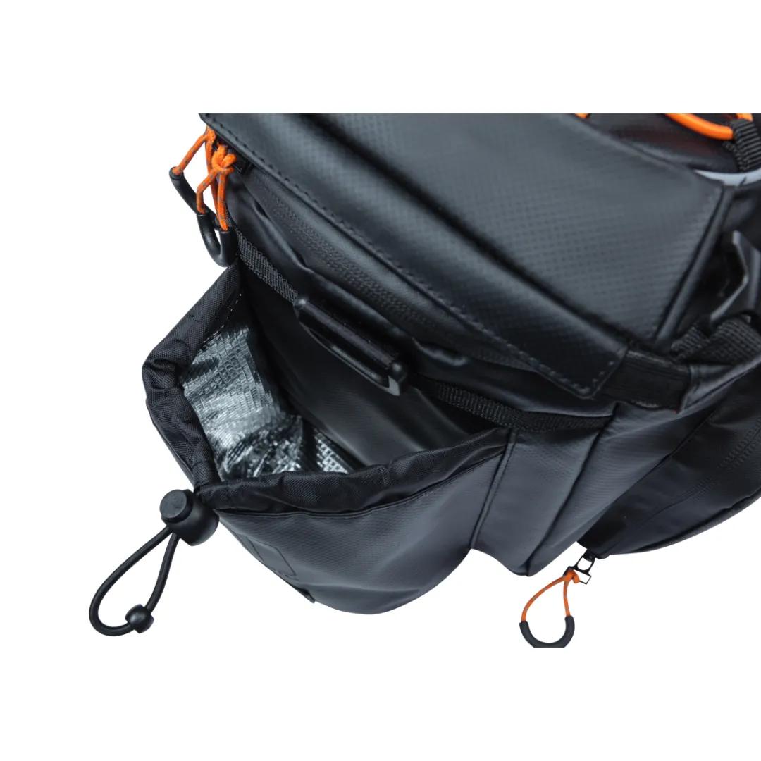 This bikepacking bag for the luggage rack not only has plenty of room, but also a few really practical features. These include compartments for cooling elements, a bottle holder and a helmet holder. In addition, the bag is very easily adjustable in size between 9-36L. The weatherproof, durable and robust tarpaulin fabric gives the bag its special look.