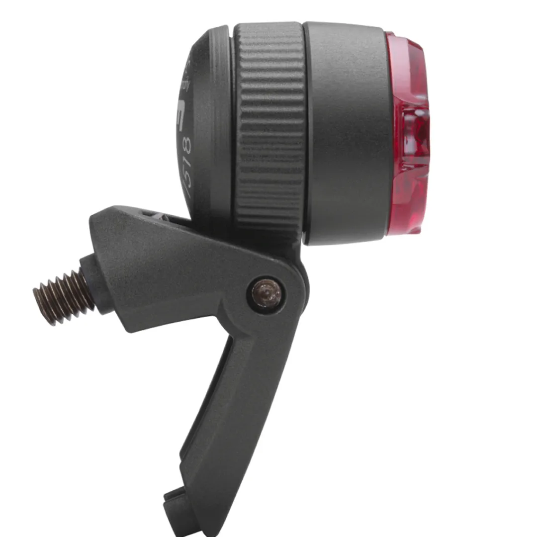 Small, smaller, mu – The developers couldn’t give the tiny B+M µ Mini e-bike tail light a better name than mu. With a diameter of only 19 mm, the luminous gnome is as small as a 2 euro cent coin and yet, the light with a discreet aluminium housing impresses with high light power and great lateral visibility. A road legal micro rear light that provides high visibility in road traffic could hardly be more minimalist. The elegant high-quality tail light goes perfectly together with beautiful design front lights for dynamo operation like the IQ-X E-Bike (e.g. product code: 2260280). Once fitted to the mudguard or seatpost with the appropriate bracket, the tiny light button perfectly blends in with the overall look of your bike. Yet, the smart µ rear light by B+M impresses with enormous light power and can definitely keep up with the big lights.