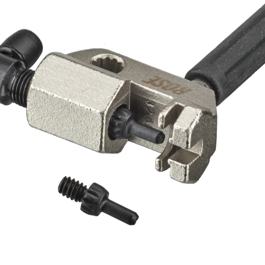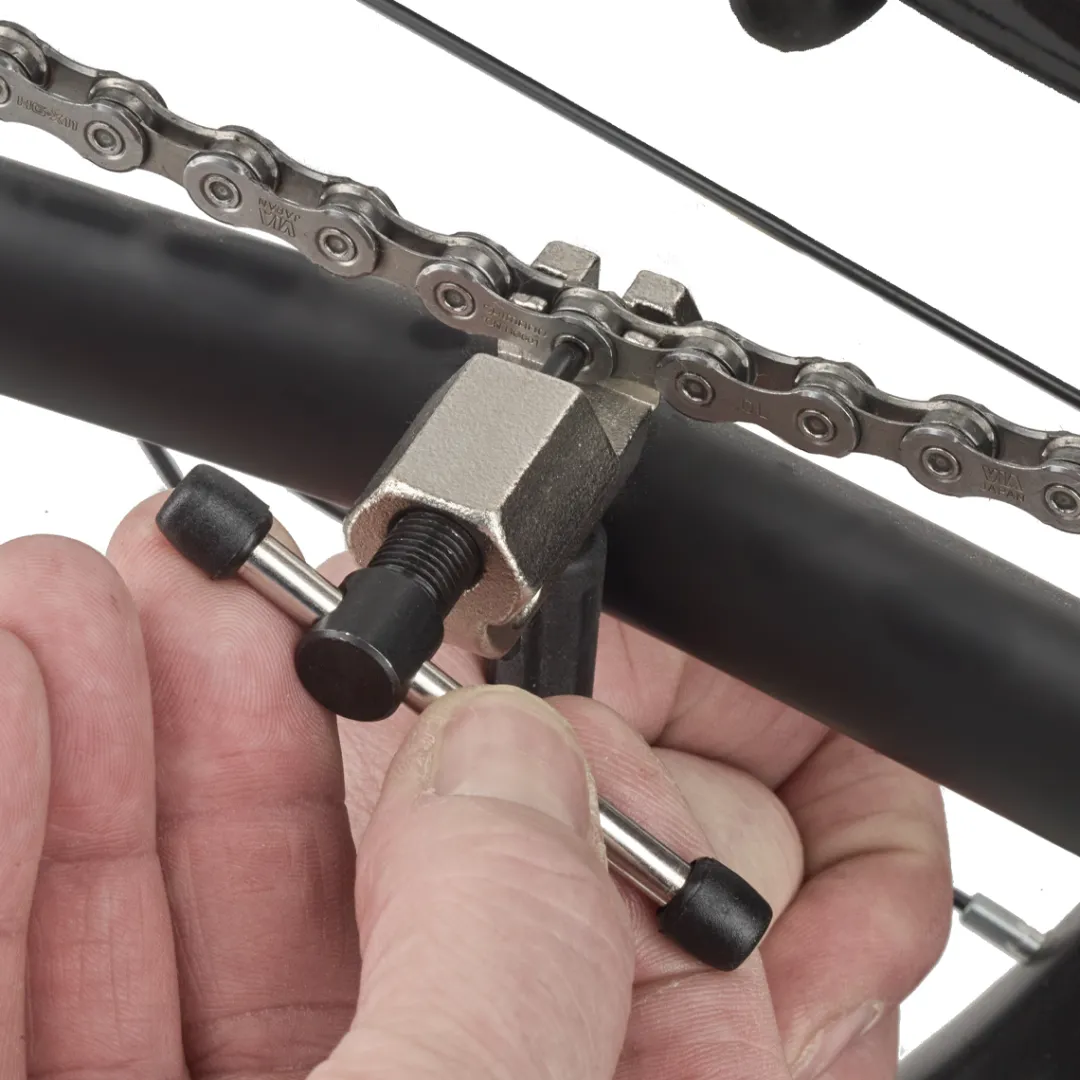 The handle of the ROSE Pinpusher II chain tool can be unscrewed, letting you better store the chain tool in your saddle bag.