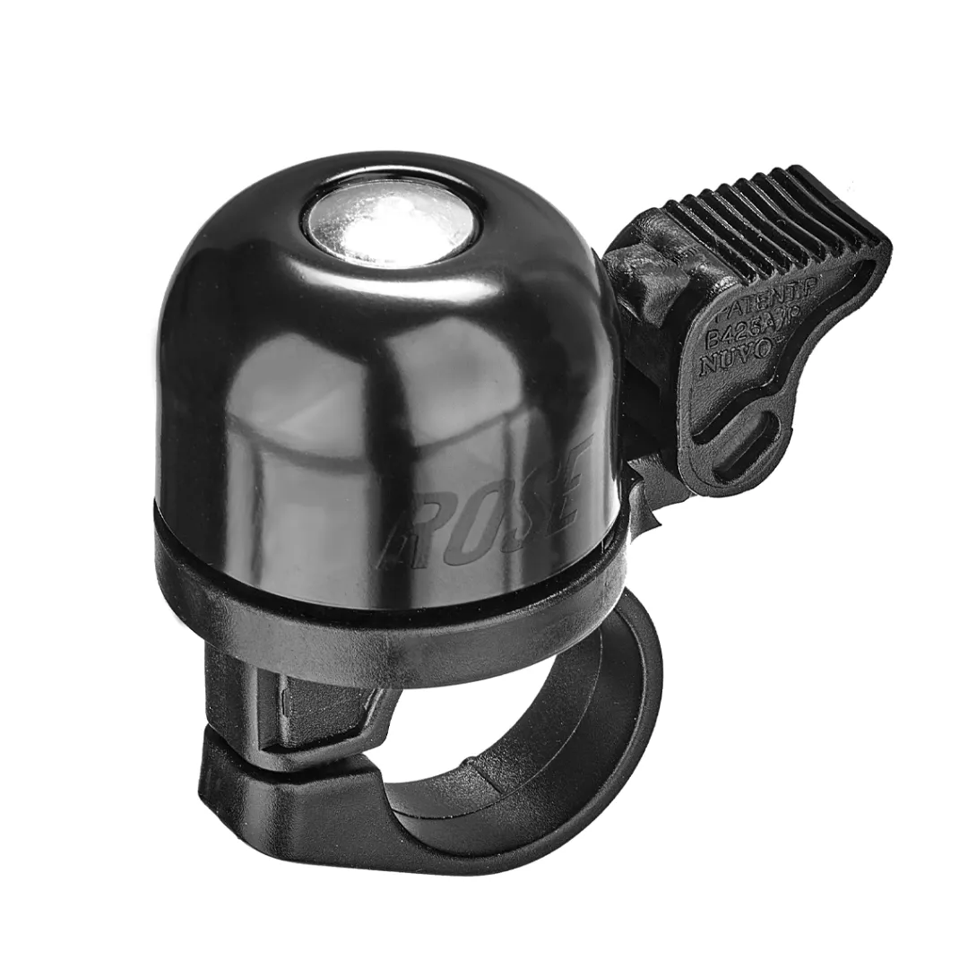 Bicycle bell with a solid hammer that can be rotated through 360°. The clamp bolt threads into a steel thread for high durability.