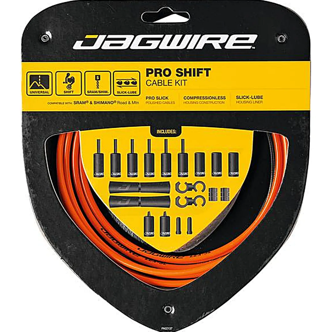 Enhance the shifting performance and look of your bike with the Jagwire Pro Shift Cable Kit! Smooth shifting and shifting precision is based on a precise adjustment of front and rear derailleur, as well as on smooth-running gear cables. The Jagwire cable kit combines polished cables with slick-lube liners, giving you constant shifting precision and crisp shifting. The coated liner allows for almost friction-free shifting action when operating the lever. The cable kit includes all parts you need to completely replace your inner and outer gear cables and thus upgrade your bike. The hooks and cable donuts supplied ensure clean cable routing along the cockpit and top/down tube. Choose your favourite from a wide range of colours and give your bike a distinctive style.