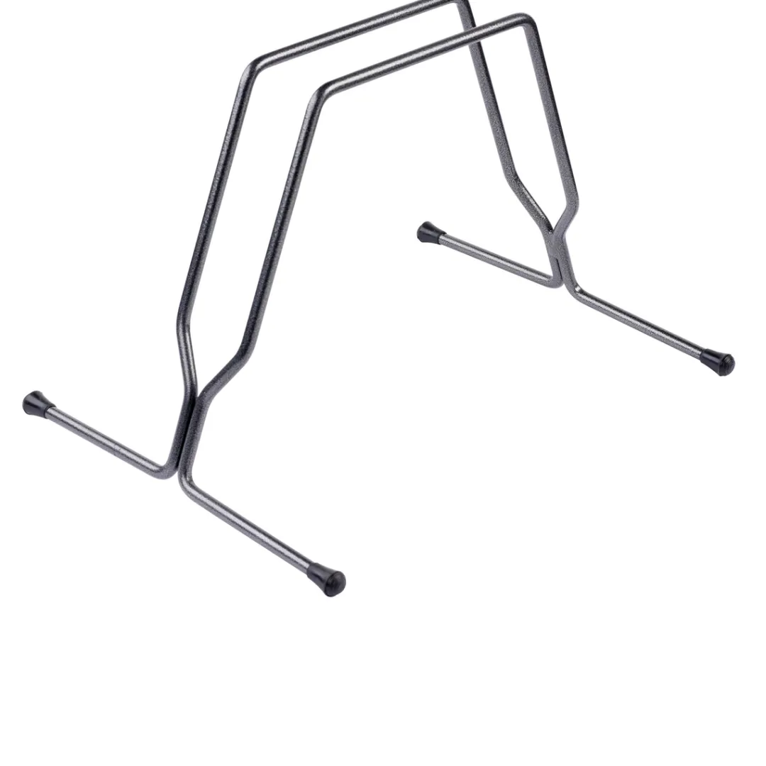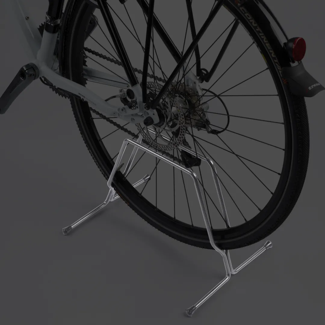 The ROSE Rastplatz SL bike stand holds your bike securely. The compact bike stand can be used for the front and for the rear wheel of road bikes, MTBs or hybrid bikes. Welded connections make this stand highly durable. Its hammer-peened surface is extremely robust. Broad feet guarantee a stable hold and safe storage of your bikes.