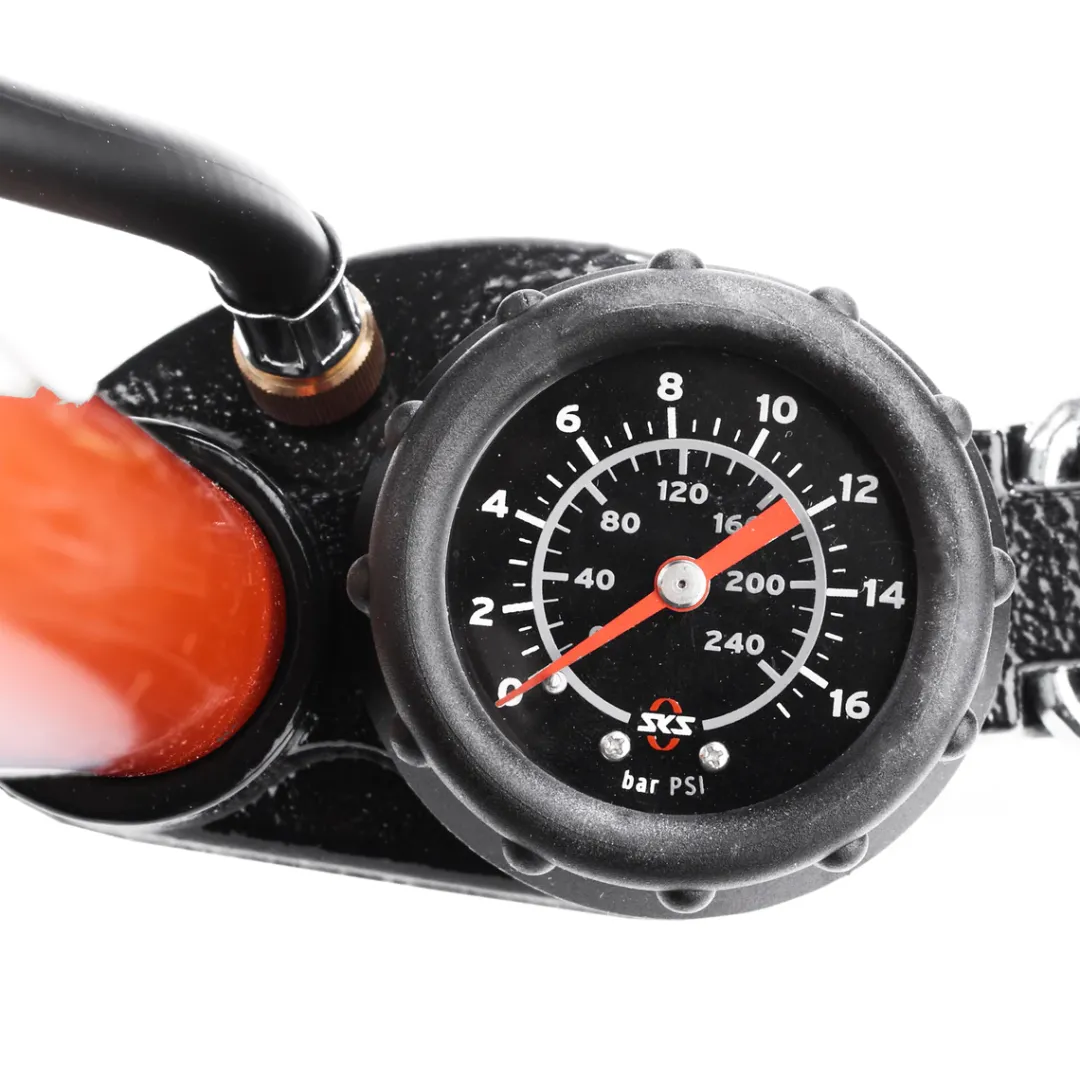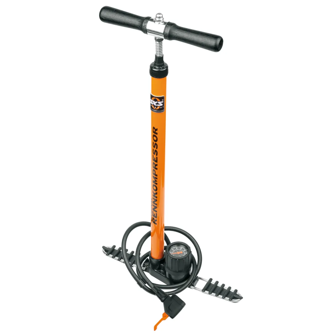 Rock solid and above all reliable – the Rennkompressor pump by SKS Germany has already been popular among international cyclists for more than 40 years now. The pump with a MultiValve head is suitable for Schrader, Presta and Dunlop valves and features and extra-long hose with a length of 120 cm. The barrel of the floor pump is designed to withstand pressures of up to 16 bars. The pump comes with fold-out steel feet, a wooden handle and is secured against slipping at the valve.