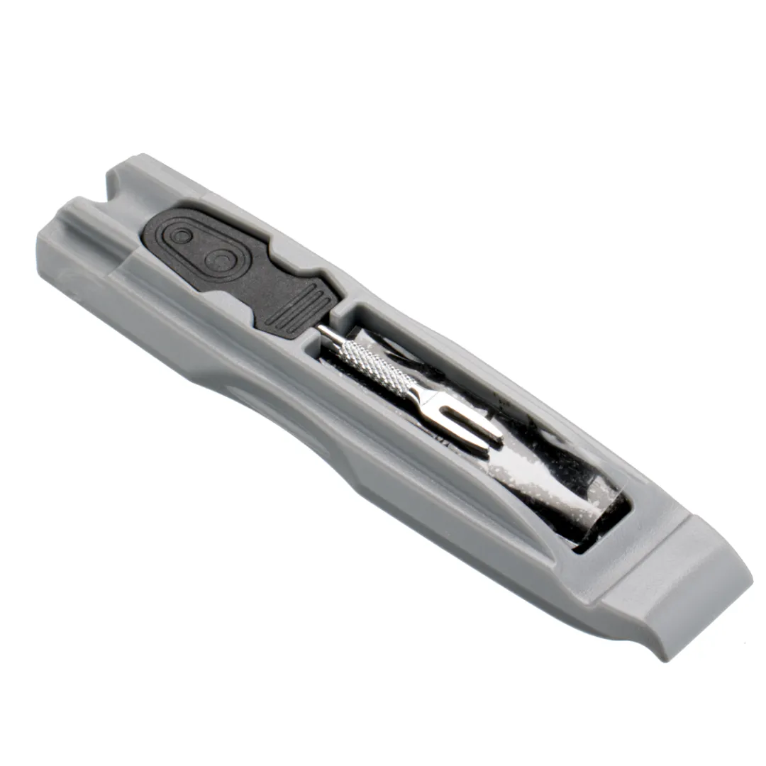 In the event of a puncture, the compact S.O.S TS2 Tube Stash emergency pack from Crankbrothers is quickly to hand on the frame to help you out on the road. While the wide Velcro strap of the frame holder holds your spare tube for example securely in place, the sturdy tyre lever with the repair kit is located directly underneath in the holder. This can also be used to repair larger holes in the tyre to get you back on the trail.