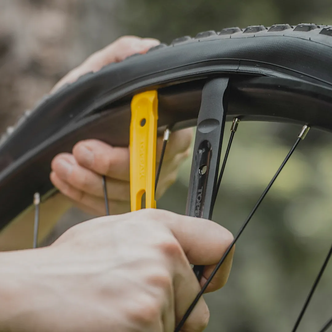 The solid 3-piece Shuttle Lever Pro tyre lever set from Topeak really comes into its own with stubborn tyres. The trio in the typical Topeak colour scheme convinces with rounded edges as a tough assembly team with good handling. When levering off the tyre, working your way around the rim piece by piece using several tyre levers makes removal easier and is also more gentle on the material.