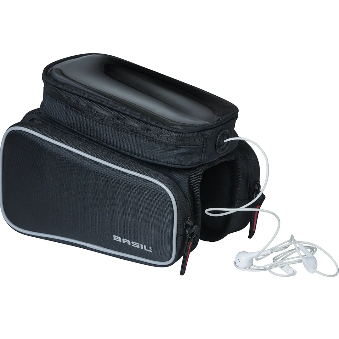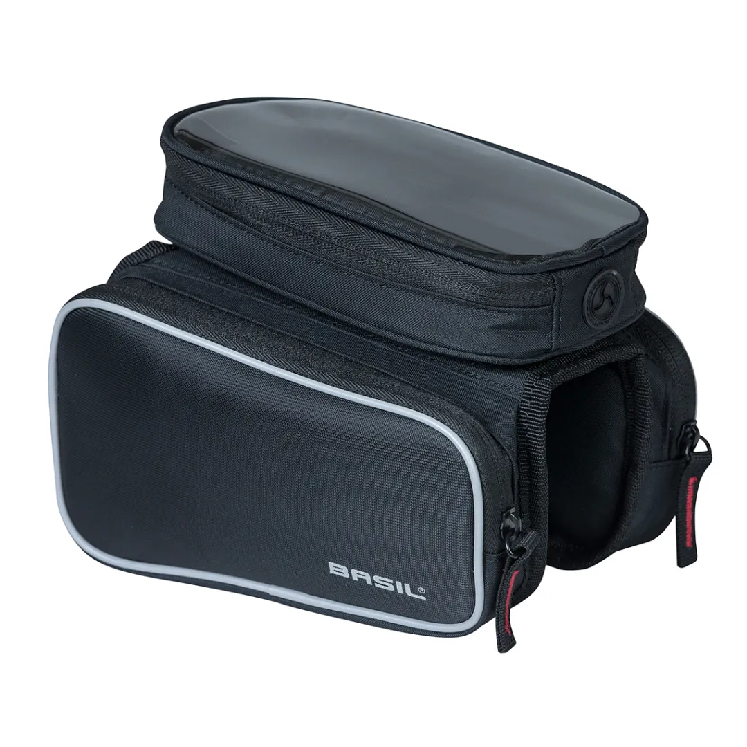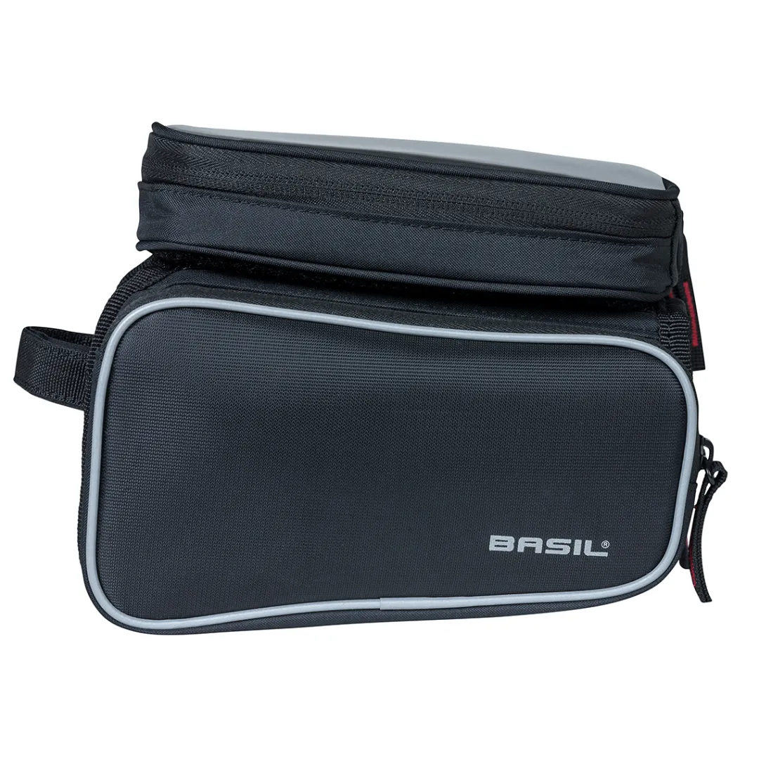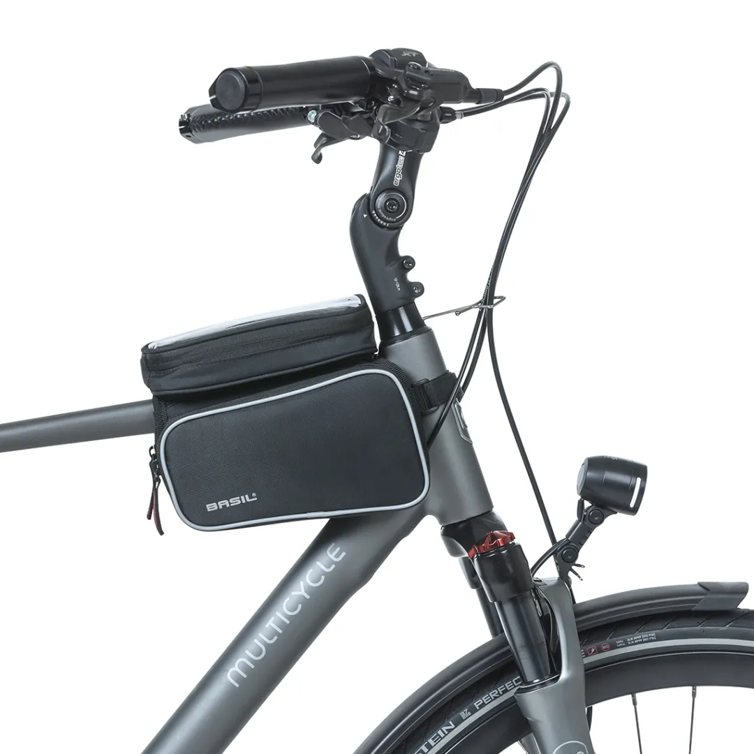 The SPORT DESIGN TOP TUBE FRAME BAG DOUBLE M by BASIL is a functional bicycle bag that can be attached to the top tube. A practical highlight is the removable touchscreen compatible pocket on top, where you can put your smartphone for navigation and remove it again with a flick of the wrist when stopping in a café.