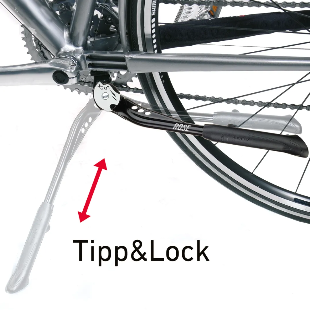 Thanks to its locking function ”Tip & Lock”, the centre stand is safely held in the upper position, an unintentional dropping during the ride is avoided. The stand is suitable for all kinds of bikes, due to the fact that the foot can be extended or pushed together within seconds.