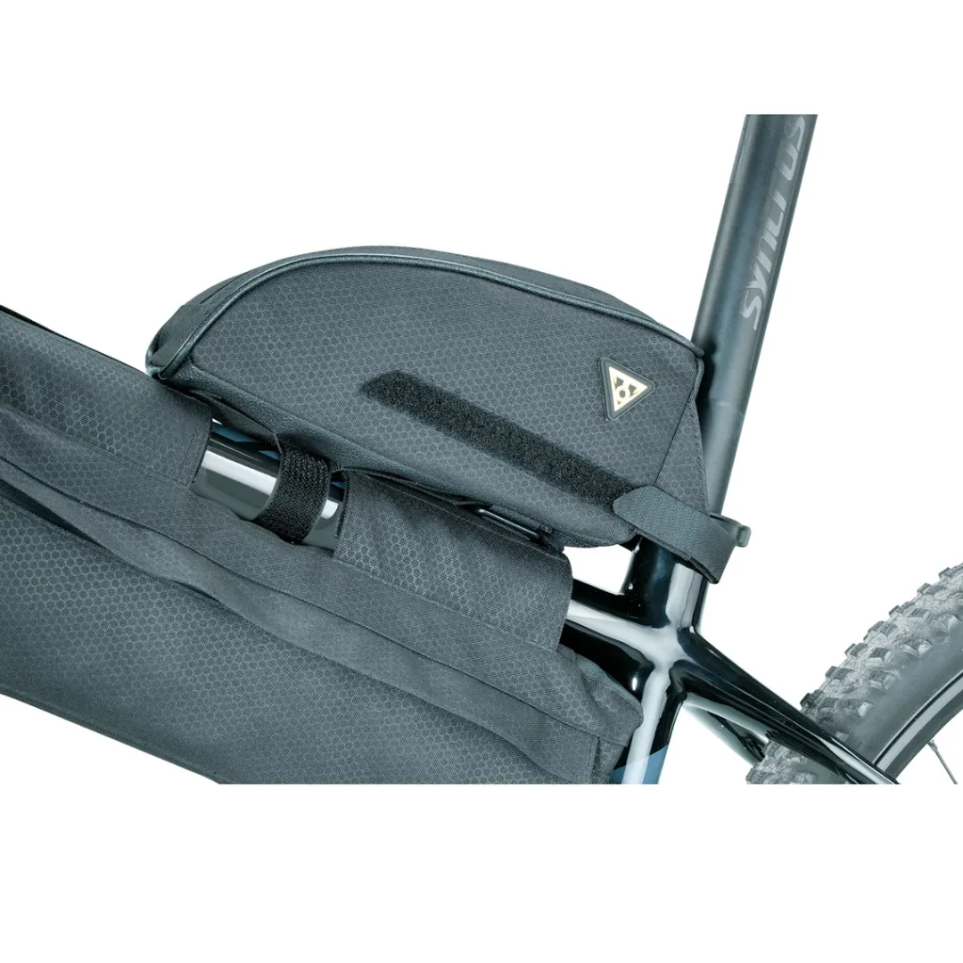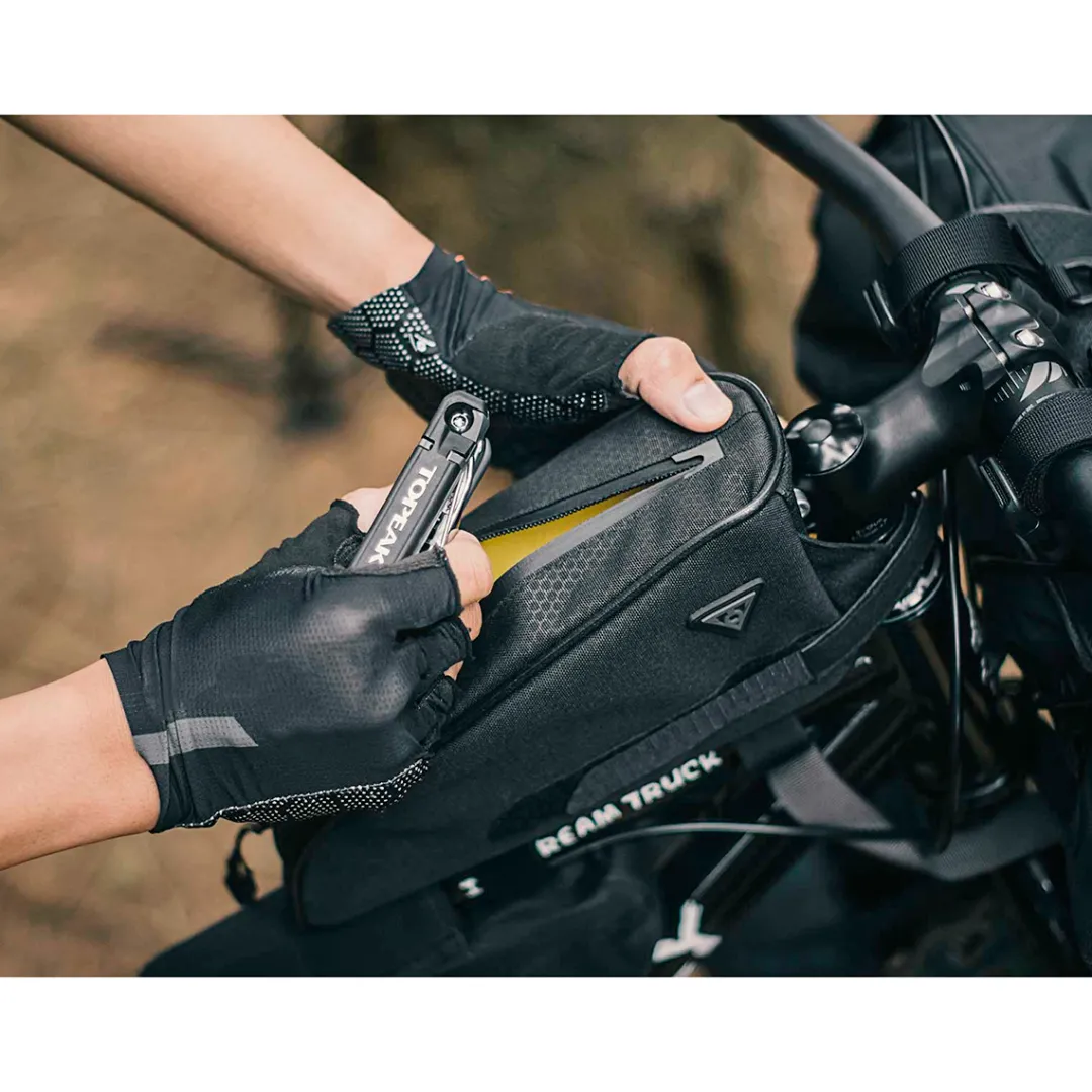 The TOPLOADER frame bag by TOPEAK lets you store your energy bars, smartphone, wallet, tools and more within easy reach. A total of 0.75 litres of storage space is available in this top tube bag. It is robust, water- and dirt-repellent and easy to attach.