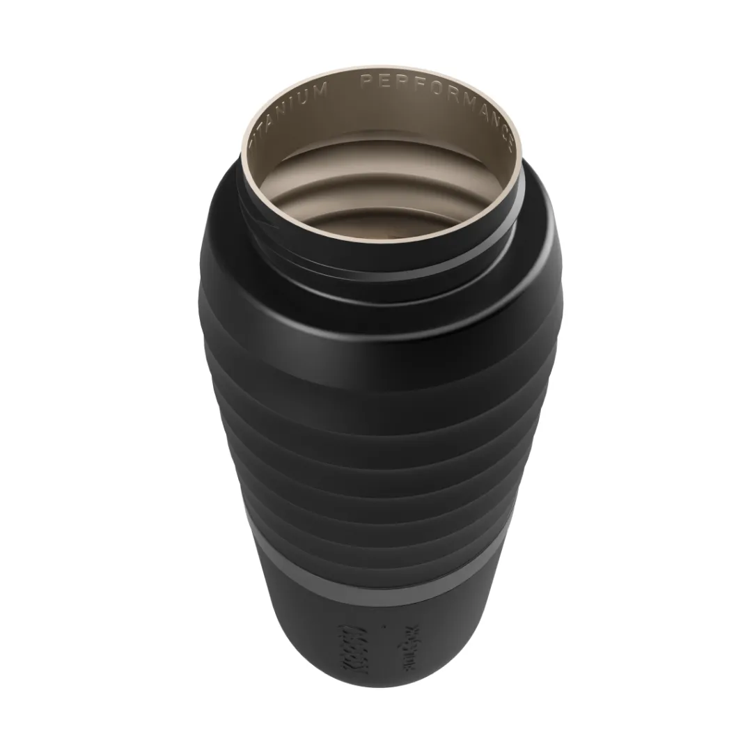 Material drinking bottle: titanium (bottle core); polypropylene (outer shell, lid); plastic, silicone (cap)