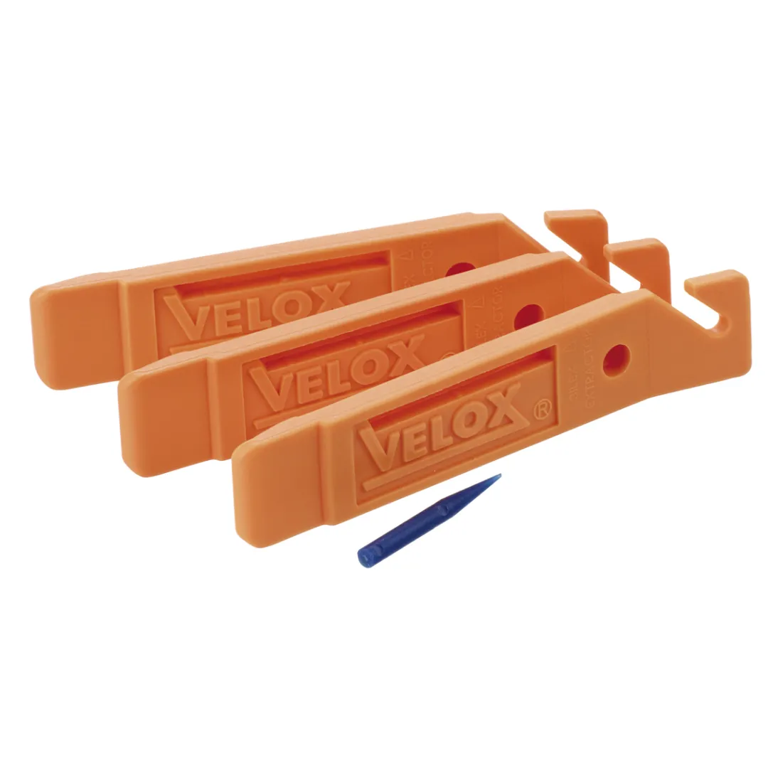 3-piece tyre lever set made of break-proof plastic that can be slightly stuck together. To facilitate tyre dismounting, you can hook the single tyre lever in at the spoke.