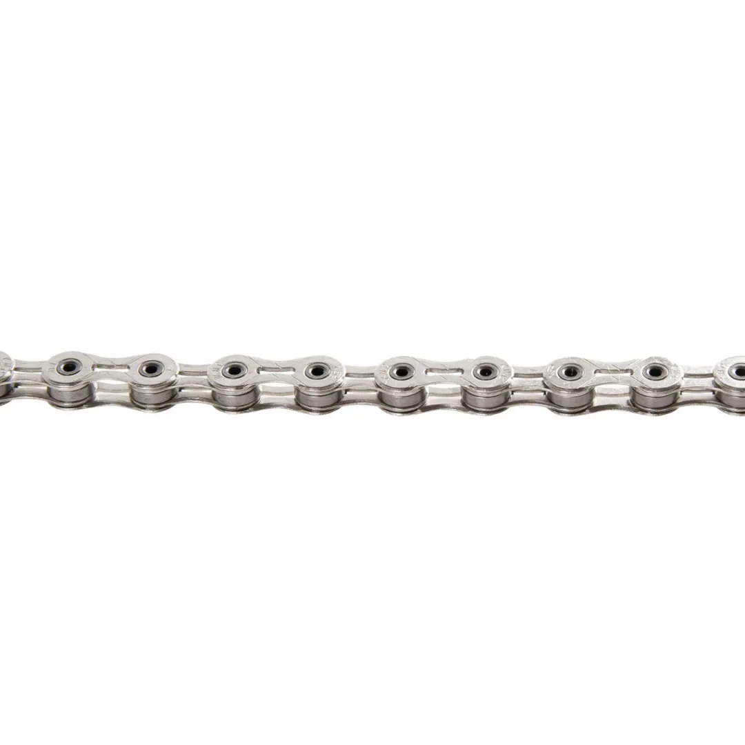 As the KMC X9SL chain is lightweight and uses less material without compromising on durability, it is the perfect choice for all 9 speed systems. The weight savings are thanks to the use of hollow pins that are riveted on the chamfered inner and outer plates to be flexible, yet also extremely tearproof. The chain’s high wear resistance results from a combination of hardened steel alloys and an abrasion-proof nickel coating. It not only protects from corrosion and reduces wear, but also improves shifting performance on and off the road – together with chamfered inner plates and the X-Bridge design.